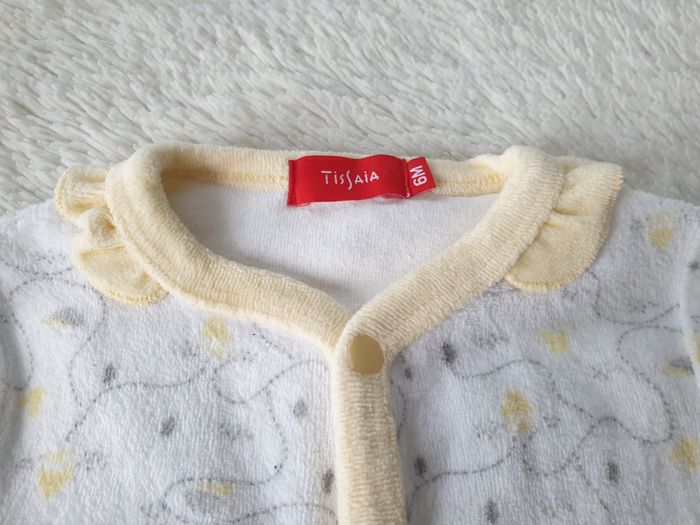 Pyjama velours blanc et jaune pâle Taille 6 mois Tissaia Pyjama velours blanc à motifs jaunes et gris col jaune froncé Fermetures avant et entrejambe à boutons pression platsique jaunes liseré jaune : sur la fermeture, sur les pieds et au niveau des mains sur les manches Bon état Prix d'achat neuf : 9€ Pour accéder rapidement au dressing fille ou 6 mois / 68 : #shoealacreme_dressingfille #shoealacreme_fille6mois