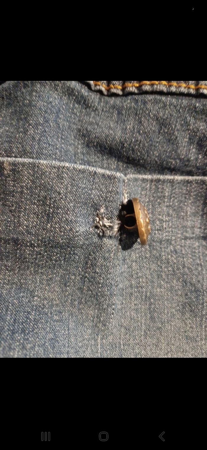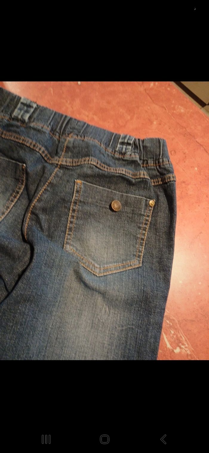 Jean court elastiqué à la taille. Longueur: 78 cm environ. Petit accro à l arrière, derrière le bouton.