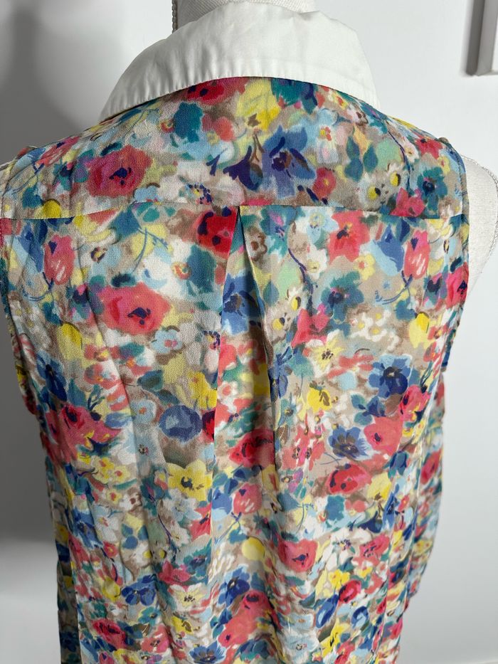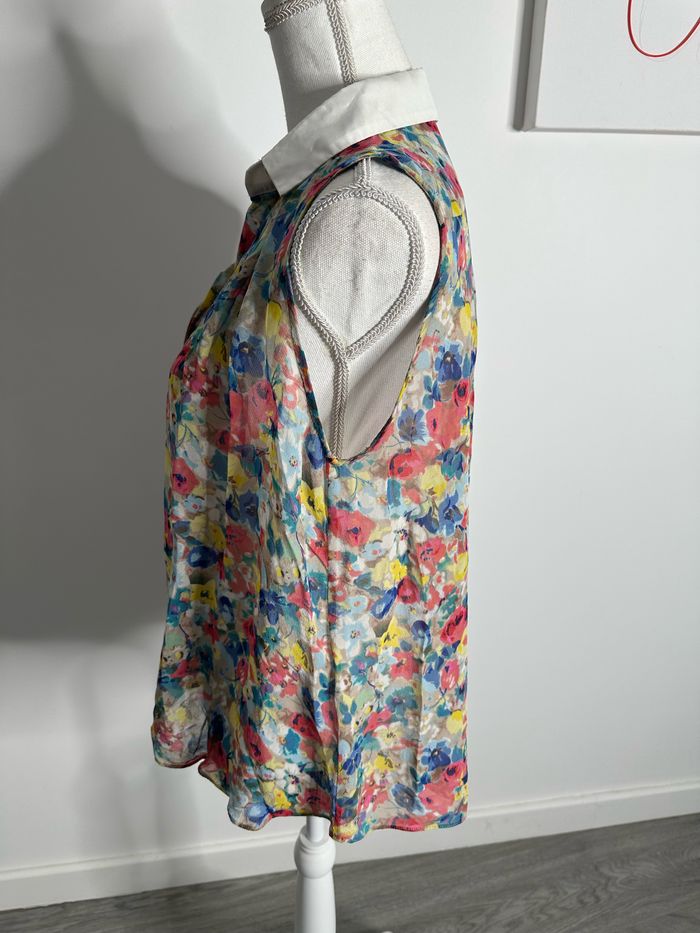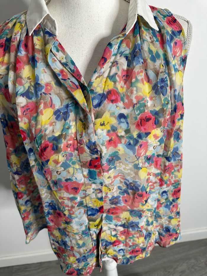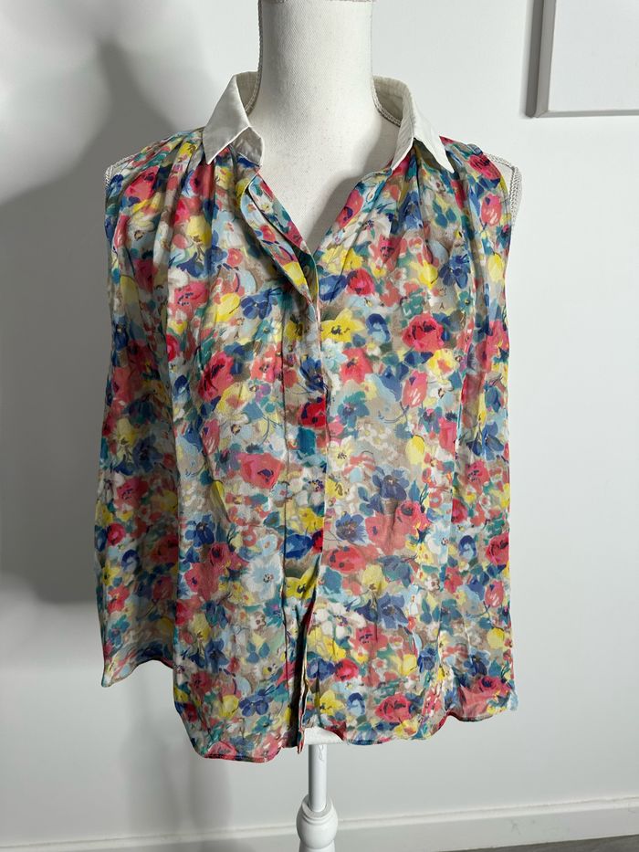 Chemise - Excellent état - Taille 1 équivalent 36 S (Dimensions en bas de l’annonce: ok du 36 au 42) - Marque Sandro - Imprimés fleurs - Tissus légèrement transparent - Se ferme avec des boutons - Sans manches - Soie et coton Dimensions: - 60cm niveau aisselles - 60cm de long