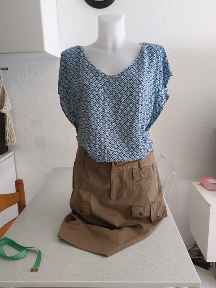 Jolie blouse col V avec liseré doré. Parfait état. Mesures 46/54/58. 100% viscose.