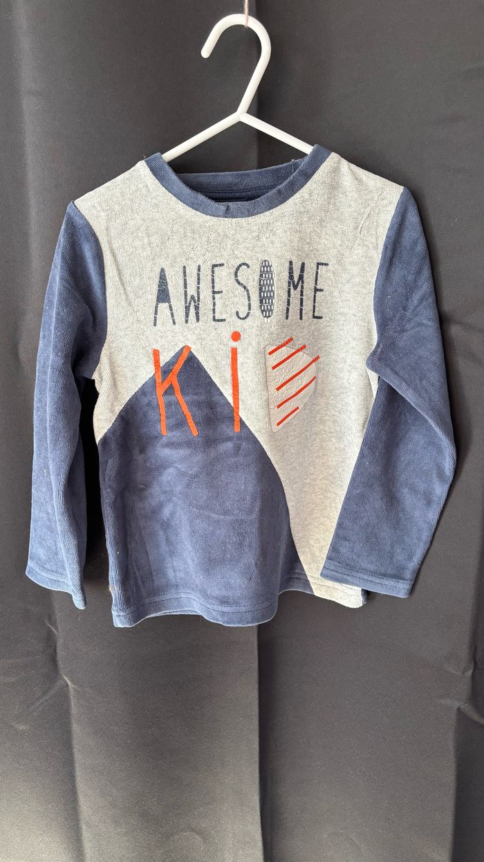 Haut gris et bleu foncé avec écriture et pantalon gris et bleu à rayures en velours