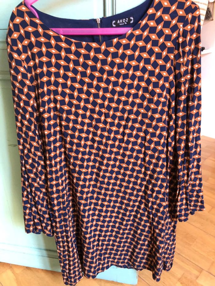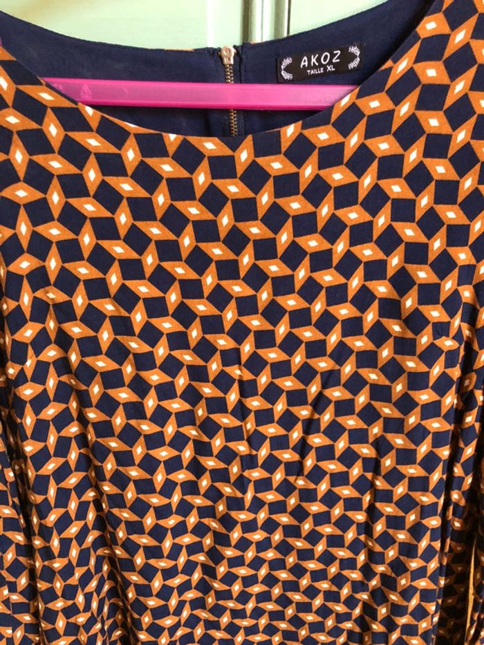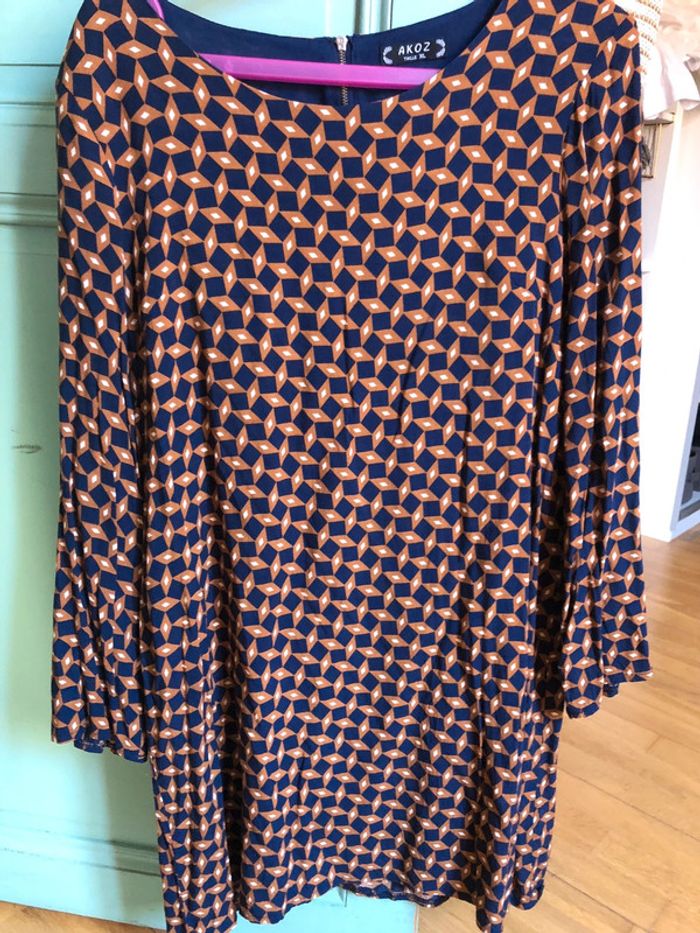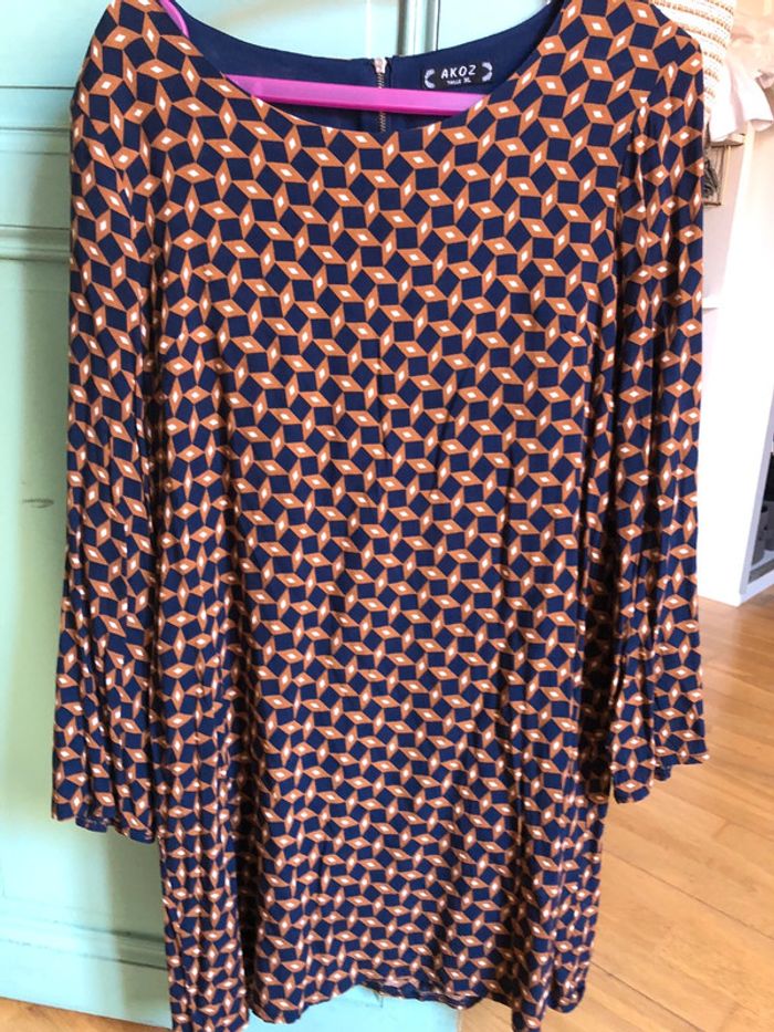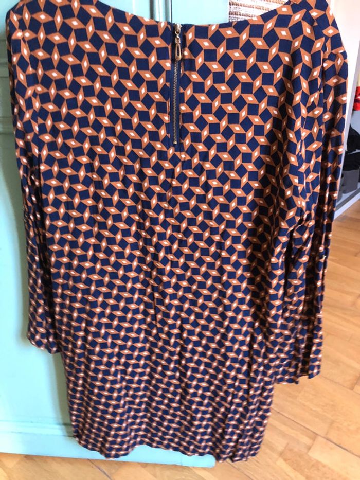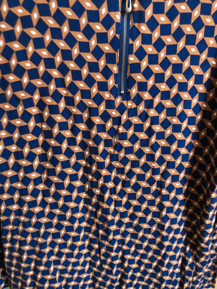 Robe en coton doublée imprimé géométrique fond bleu marine motif marron moutarde