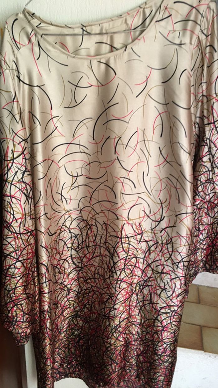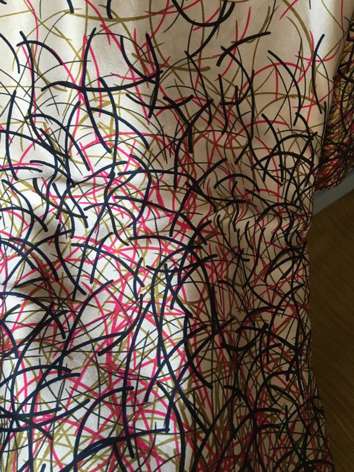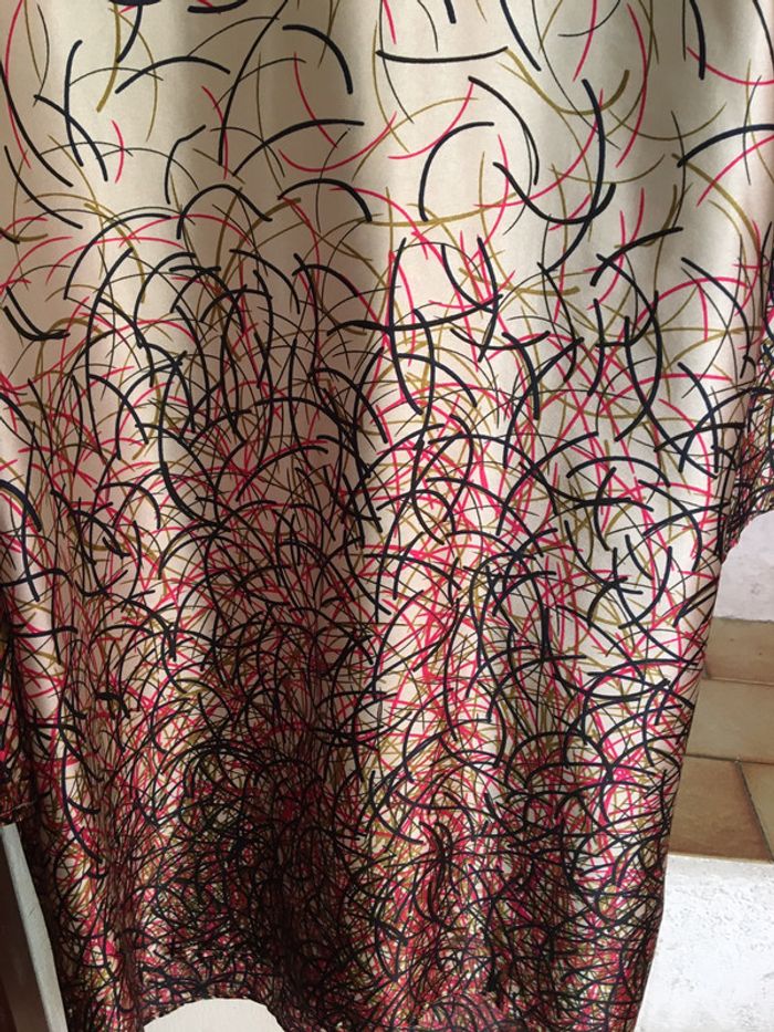robe matière fluide arabesques multicolores sur fond crème col rond manches évasées très joli tombé taille 42 mais convient à partir du 38 si vous avez porté large et peut être ceinturé