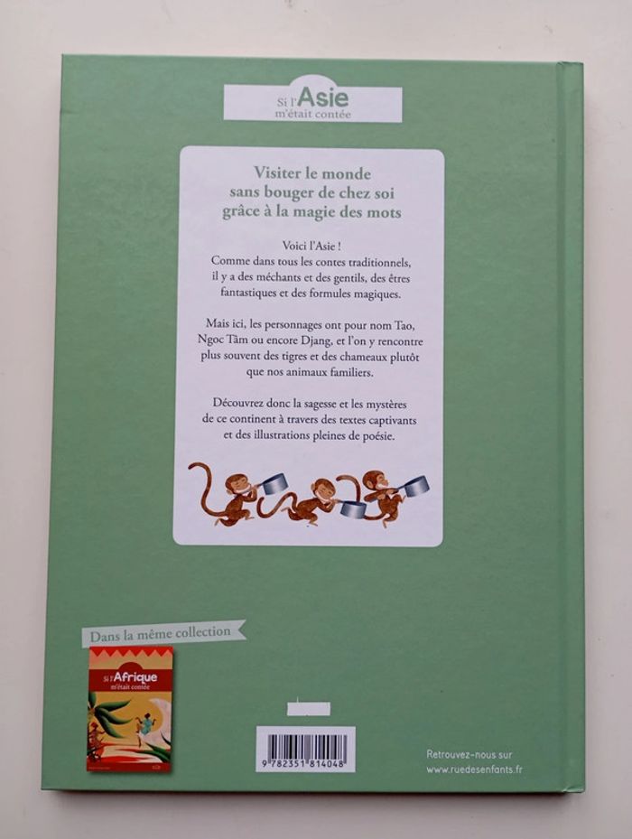 Visiter le monde sans bouger de chez soi, grâce à la magie des mots. Voici l’Asie ! Comme dans tous les contes traditionnels, il y a des méchants et des gentils, des êtres fantastiques et des formules magiques. Mais ici, les personnages ont pour nom Tao, Ngoc Tâm ou encore Djang, et l’on y rencontre plus souvent des tigres et des chameaux plutôt que nos animaux familiers. Découvrez donc la sagesse et les mystères de ce continent à travers des textes captivants et des illustrations pleines de poésie. Éditeur ‏ : ‎ RUE DES ENFANTS Relié ‏ : ‎ 48 pages Âge de lecture ‏ : ‎ Dès 7 ans Dimensions ‏ : ‎ 21 x 1.2 x 29.2 cm Livre en parfait état Je vends un autre livre de la même collection #phil_peg_contes #asie #contes