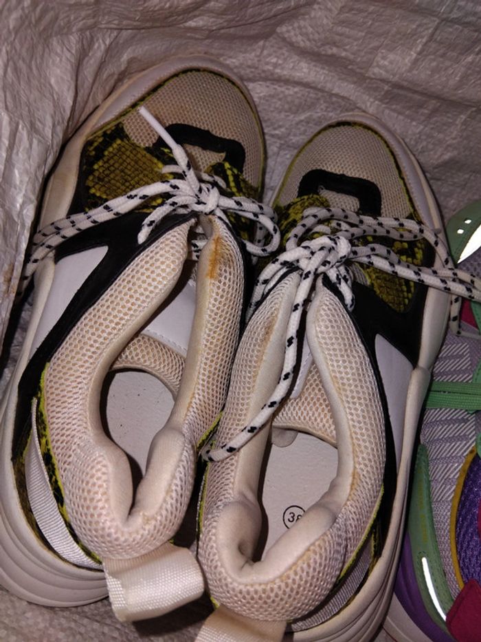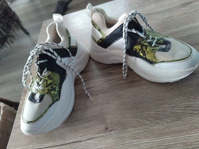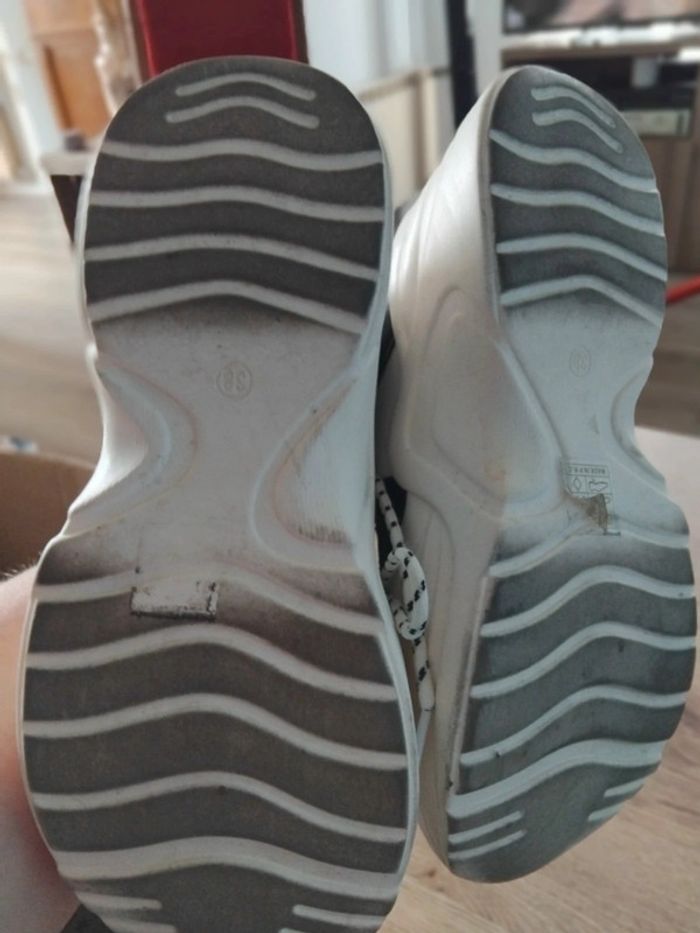 Bonjour, je vends ces baskets compensées de 6cmq blanches noires et vertes taille 38 en très bon état.