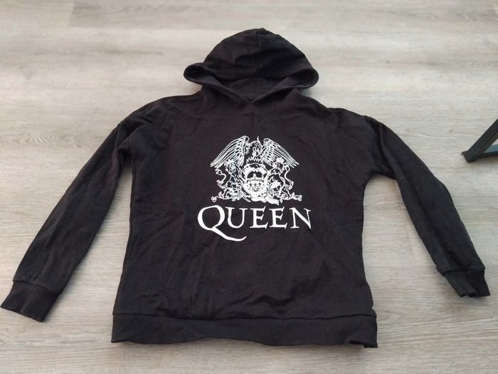 Bonjour, je vends ce sweat à capuche noir motifs blanc de la marque cache cache taille XS en très bon état. Lavé maison non fumeur.