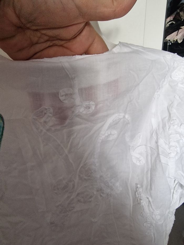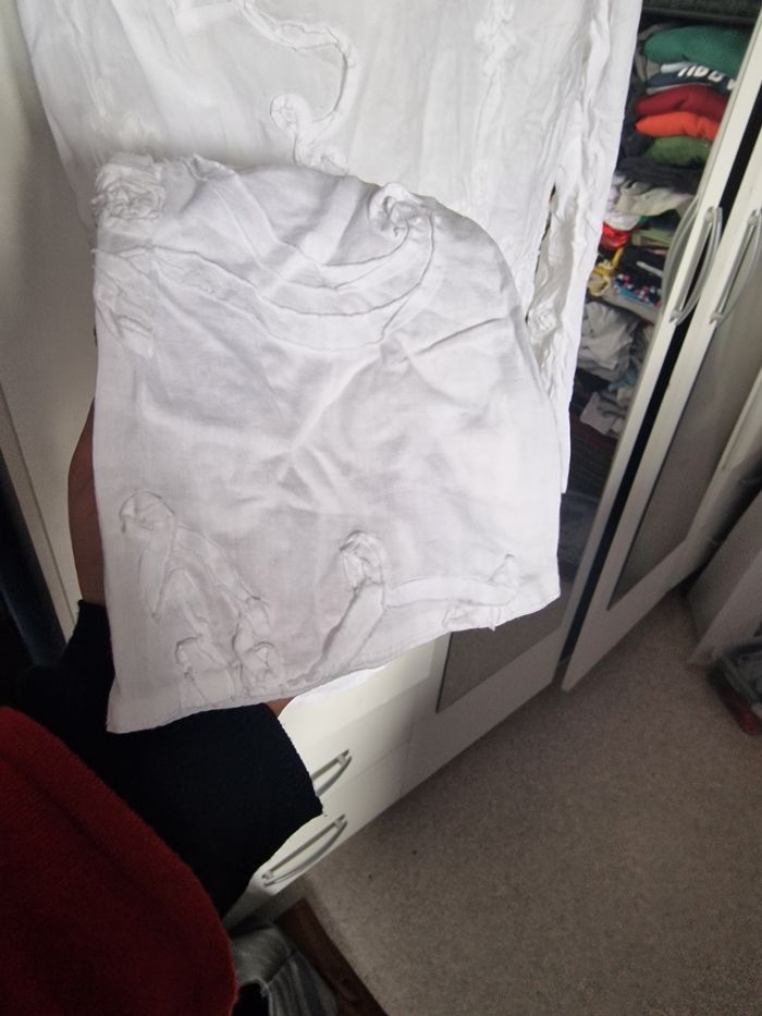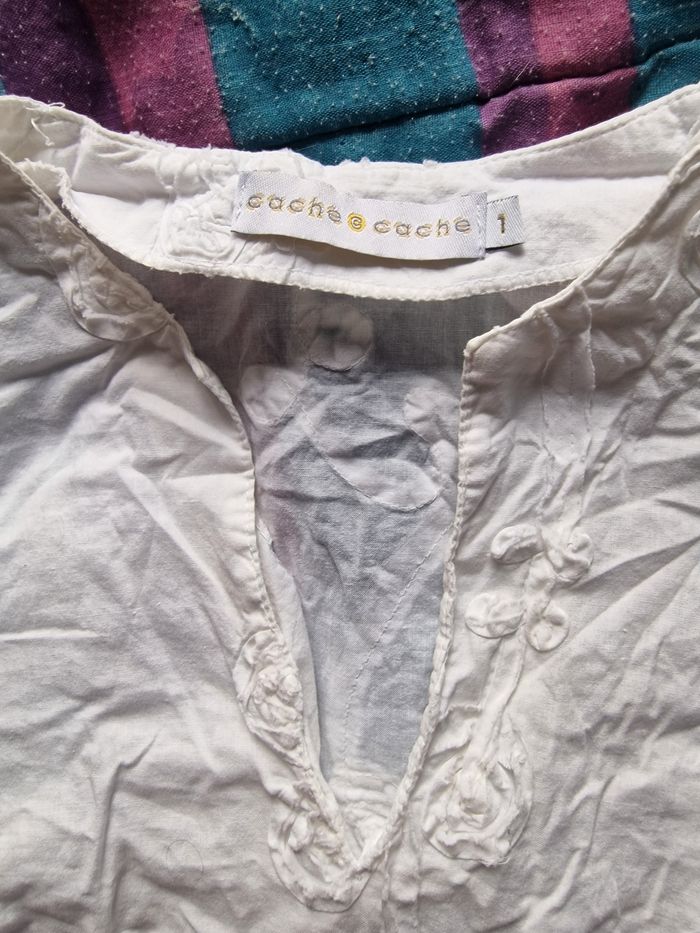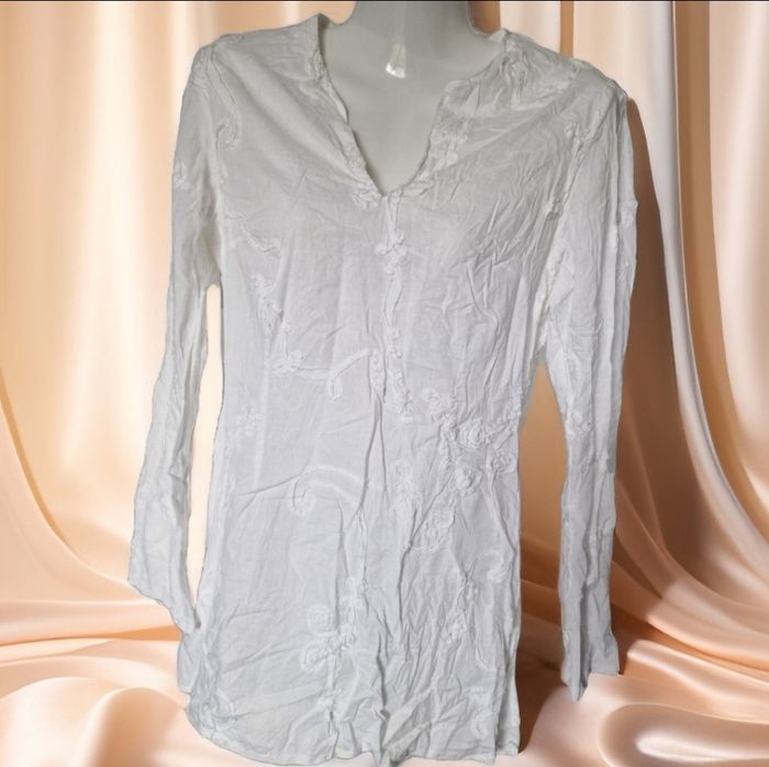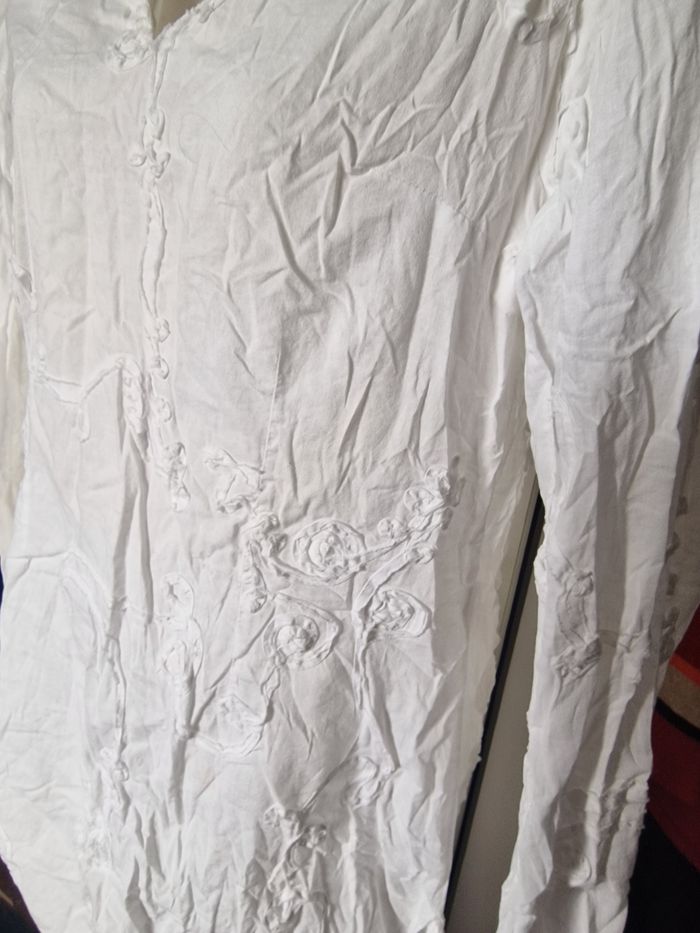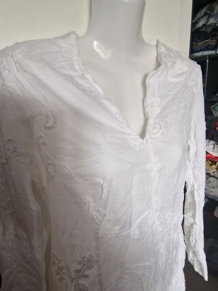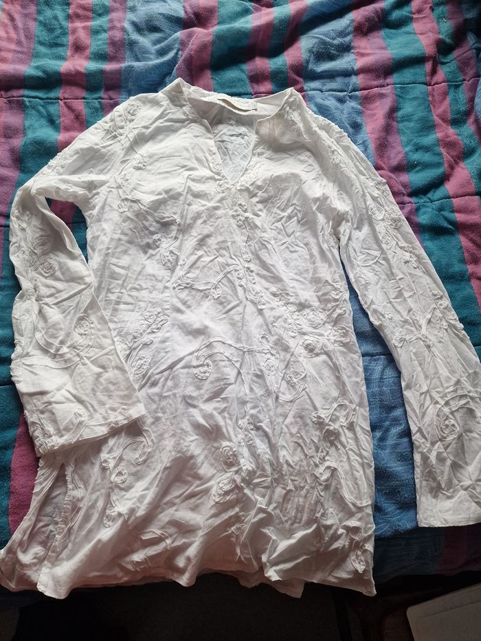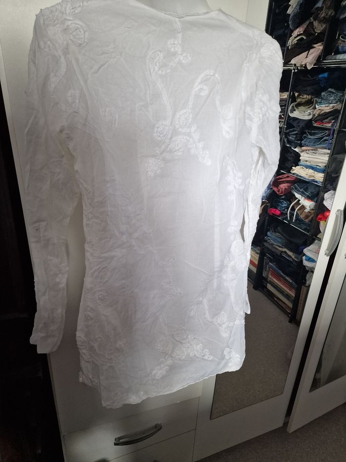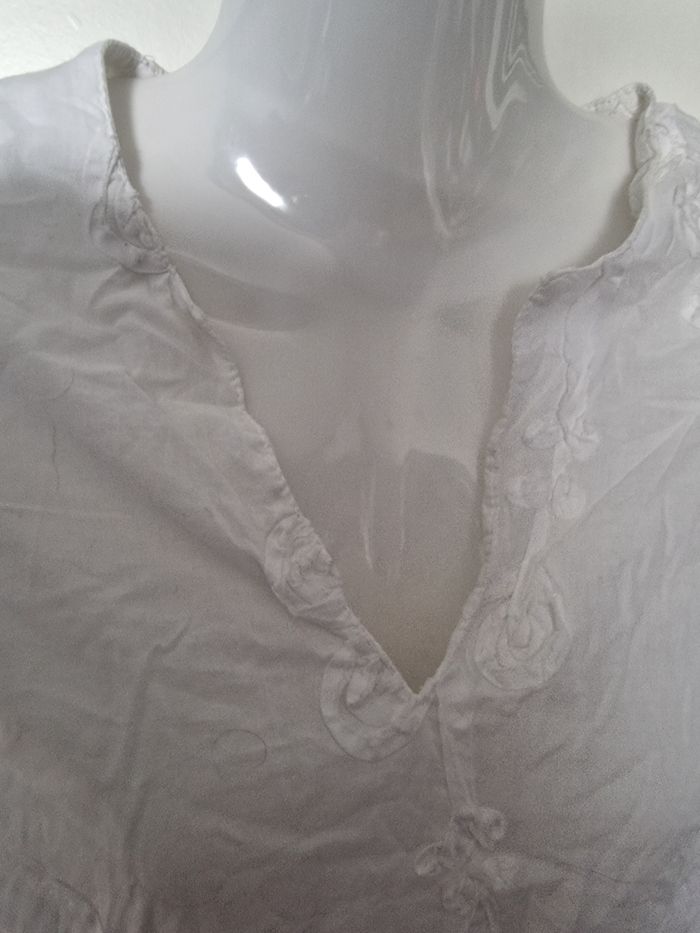 Elle est blanche, cintrée, longue et fendue de chaque côté. Son tissu legerement voilé est clairsemé de broderies fantaisie. Sa coupe cintrée, son col semi ouvert et ses manches évasées le rendent ultra féminin. Mesure aisselles 44cms a plat (tissu non extensible) Mesure taille 38cms à plat Hauteur 71cms Je n'ai pas remarqué d'anomalie