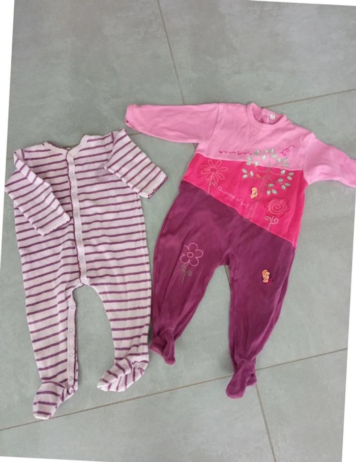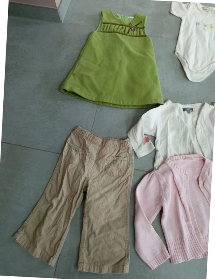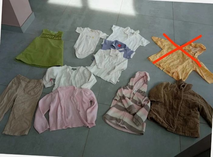 2 pyjamas, 1 robe chaude, 1 pantalon, 1 body manches courtes, 2 polos manches courtes, 1 haut manches longues, 2 gilets, 1 veste polaire et 1 manteau bien chaud. Un peu toutes les marques #18moismadie57