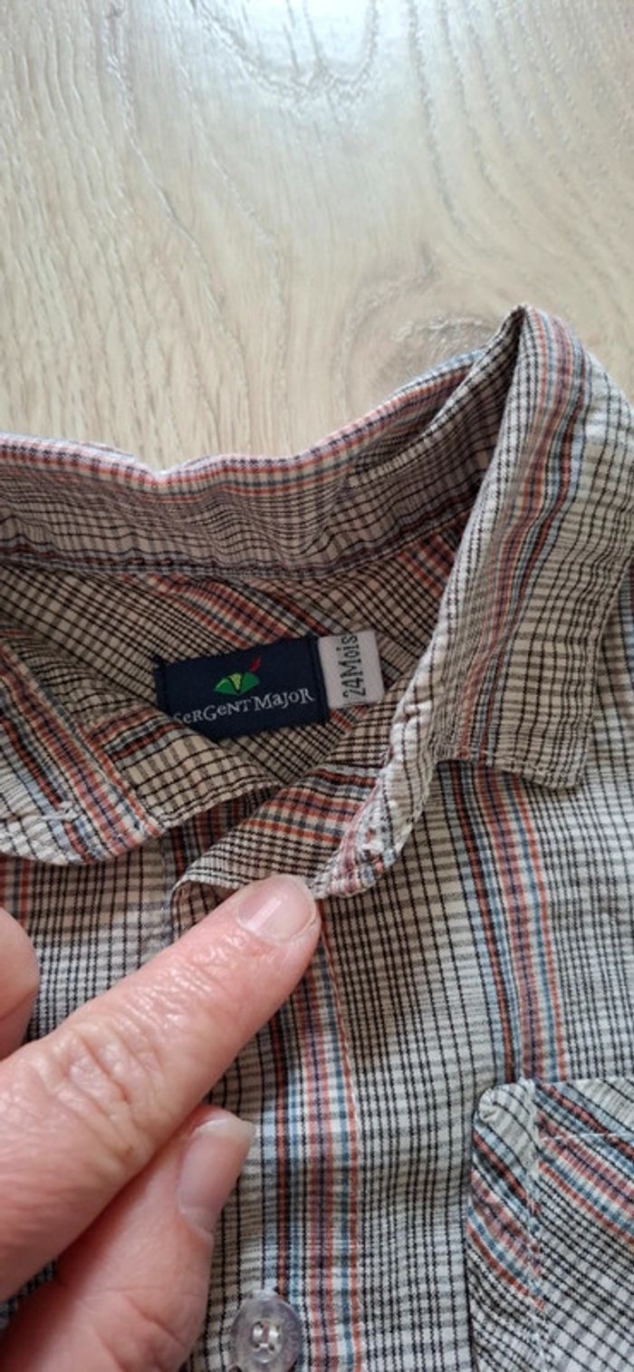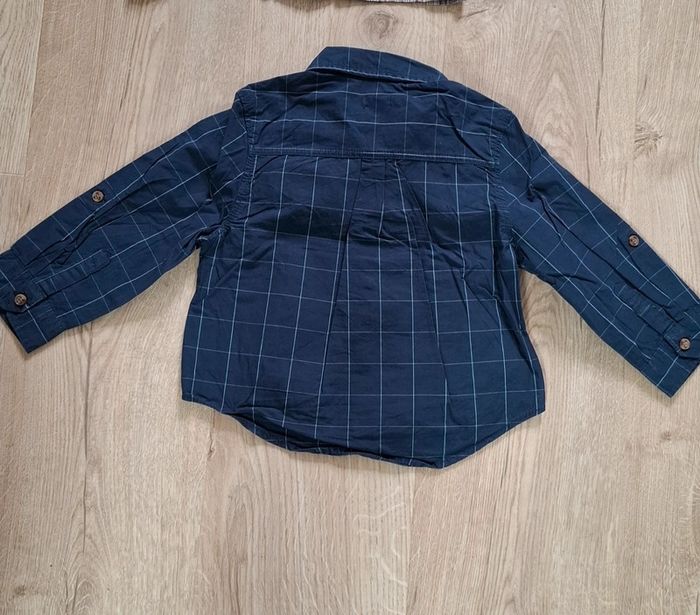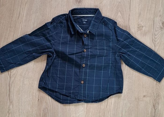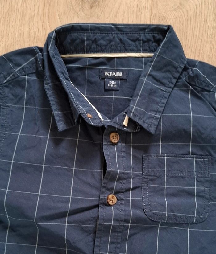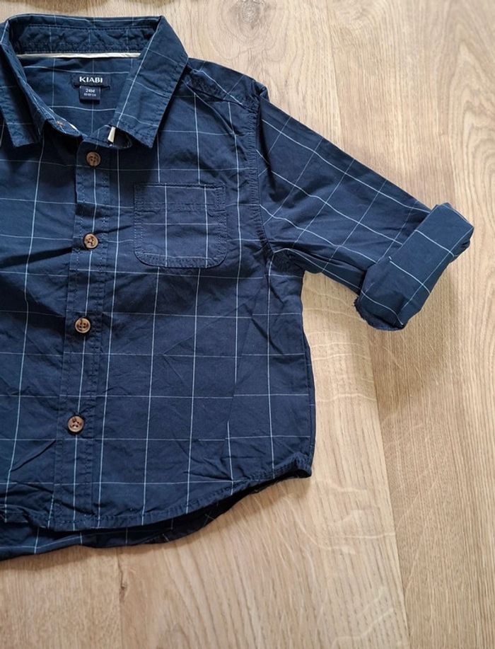 - 1 bleu marine à carreau (traits blancs), 24M/83-89cm, Kiabi, Possibilité de remonter les manches pour faire une chemisette. Neuve, lavée jamais portée.
