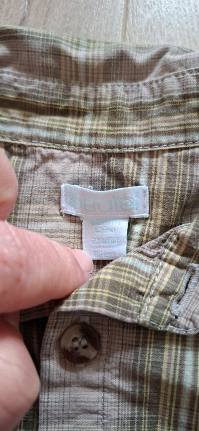 - 1 beige a carreaux kaki, 23mois/86cm Obaïbi, bouton d’avance en place, TBE, portée x2.