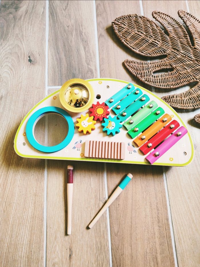 🎶Jeu d'éveil - Table d'éveil musicale en bois multi activités - JB705 🎀Convient dès l'âge de 2 ans 🎀Éveillez l'artiste qui sommeille en votre enfant avec cette magnifique table musicale en bois. 🎀C'est un véritable jeu d'éveil complet qui regroupe plusieurs instruments et activités de manipulation sur un seul support compact ✨Xylophone coloré : 8 lames de métal pour découvrir la gamme et les sons. ✨Cloche dorée : Un son cristallin pour ponctuer le rythme. ✨Tambourin intégré : Pour travailler la percussion. ✨Grattoir (Guiro) en bois : Pour découvrir de nouvelles textures sonores. ✨Engrenages rotatifs : Trois roues dentées (avec motifs lapin et renard) pour la motricité fine. ✨Accessoires : avec deux mailloches en bois adaptées aux petites mains 🎀Jouet de seconde main comportant quelques traces ❇️N'hésitez pas à créer un lot pour économiser sur les frais de port❇️ Premier âge, Jouet bébé, Jouet d'activité, Jouet ludique, Jouet eveil, Mémorisation, Memoire, aptitude, motricité, jeu Adresse, Montessori, jeu bois, Jouet bois, Jouet vintage, Jeu adresse, jeu apprentissage, dextérité, jeu sensorielle, jeu educatif, activités et Jouet pour bébé, trier empiler, encastrer, jeux et jouets