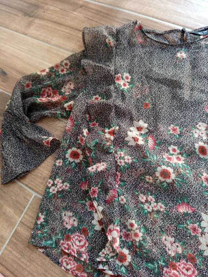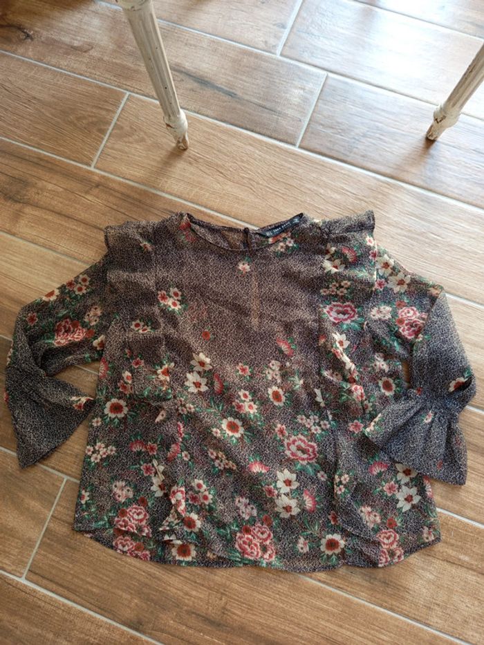Blouse voile transparent fleurie dans les tons de marron/rose/rouge Volants épaules Manches 3/4 Zara , taille S