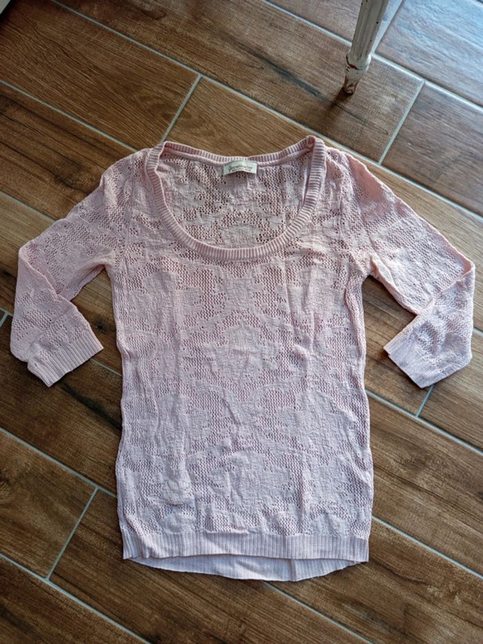 Pull fin coton manches 3/4 rose nude Stradivarius Taille S Maille ajourée,motifs fleurs