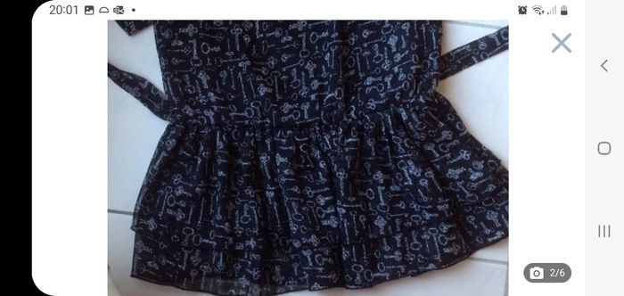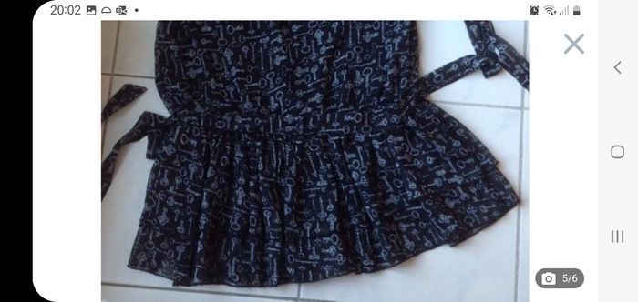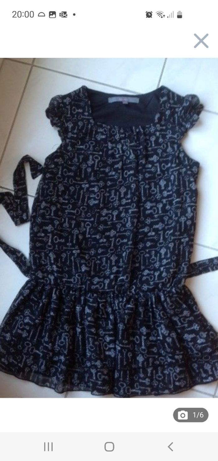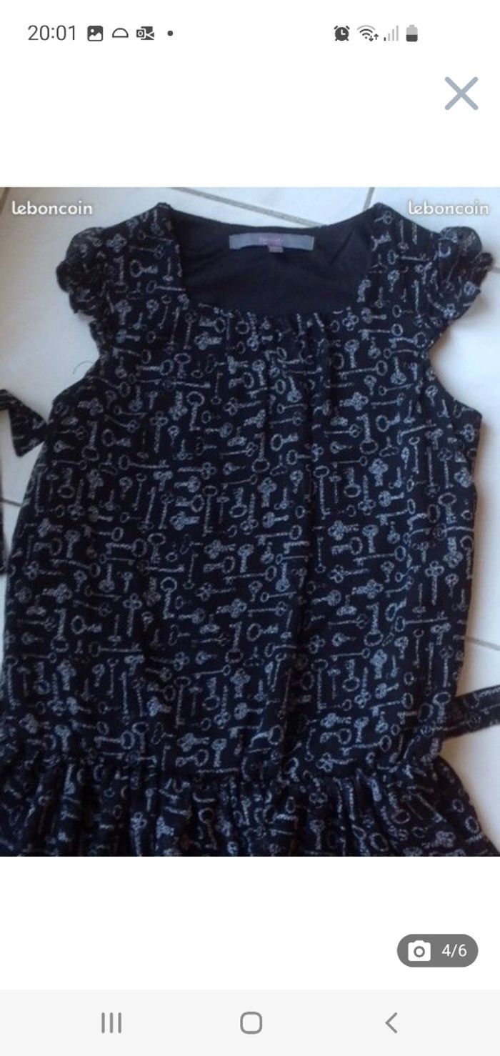 Vends robe tunique, de couleur noire avec imprimés écrus, sans manches, de taille 10 ans. Fronces sur le devant, passants pour ceinture, volants sur le bas. 100% polyester. Peut se porter en robe, ou bien en tunique sur un pantalon. Peut se porter également avec un col roulé dessous et un petit gilet. Excellent état, comme neuve.