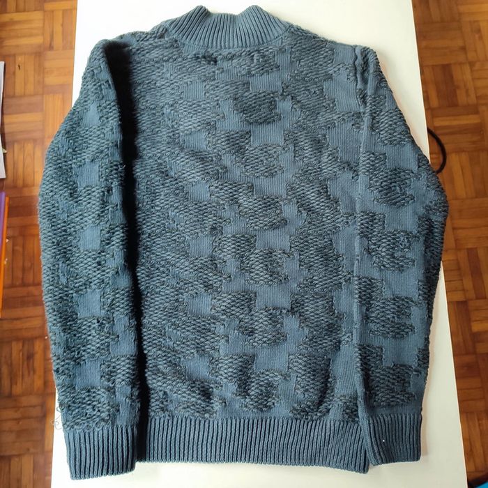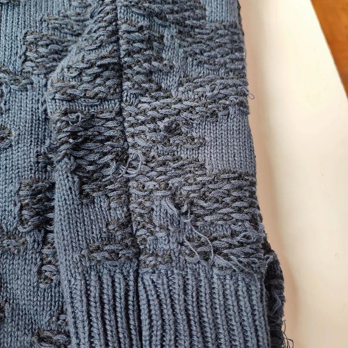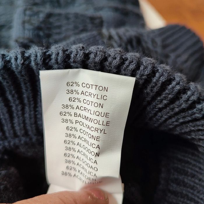 Largeur au niveau des aisselles 50 cm, longueur 65 cm . Le pull est neuf mais par endroits il y a des mailles qui sont plus longues avec des boucles de fil visibles, d'où le prix très réduit. Il est possible de les tirer vers l'intérieur avec un crochet mais c'est pour une personne patiente !