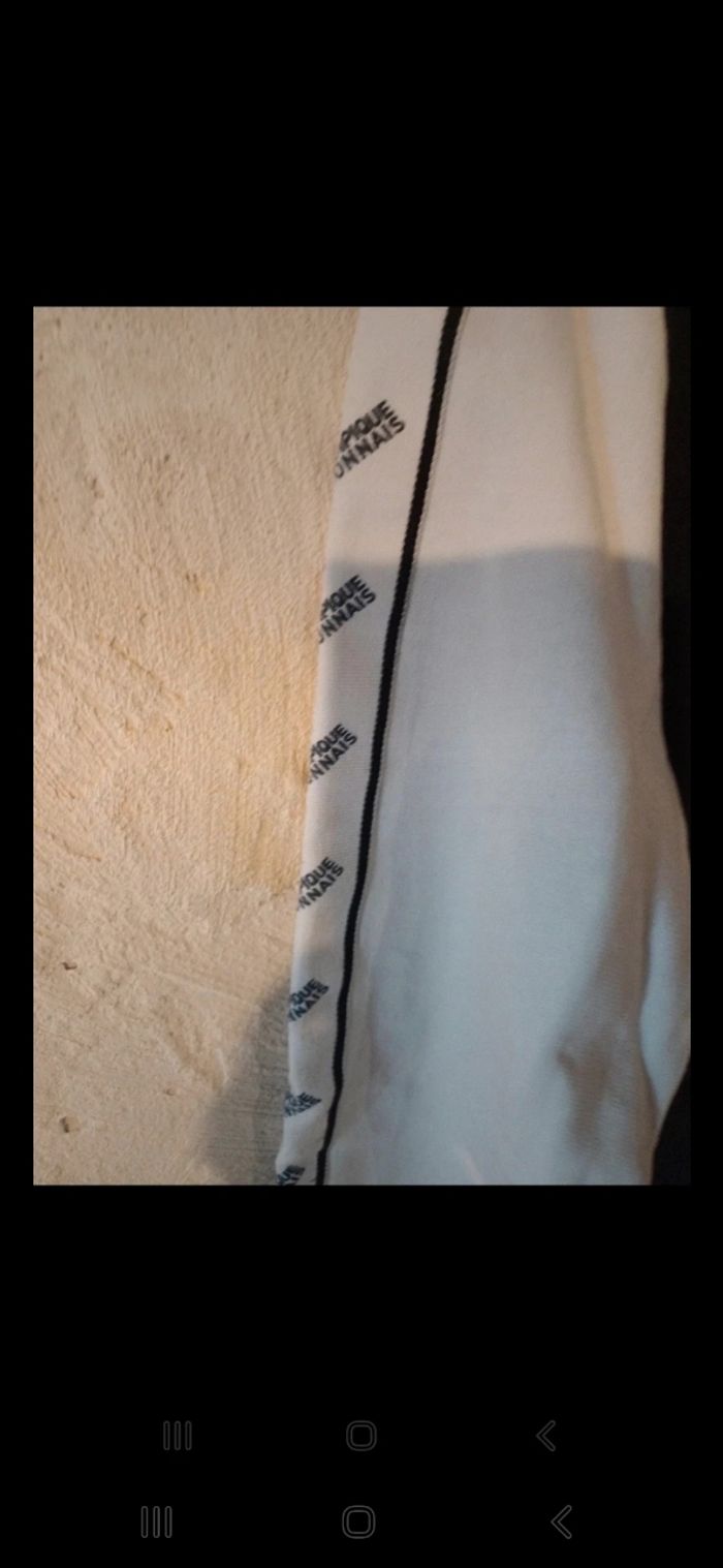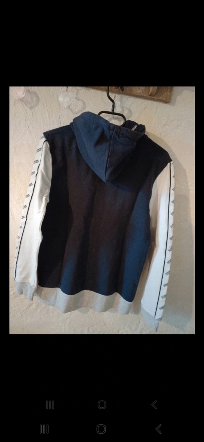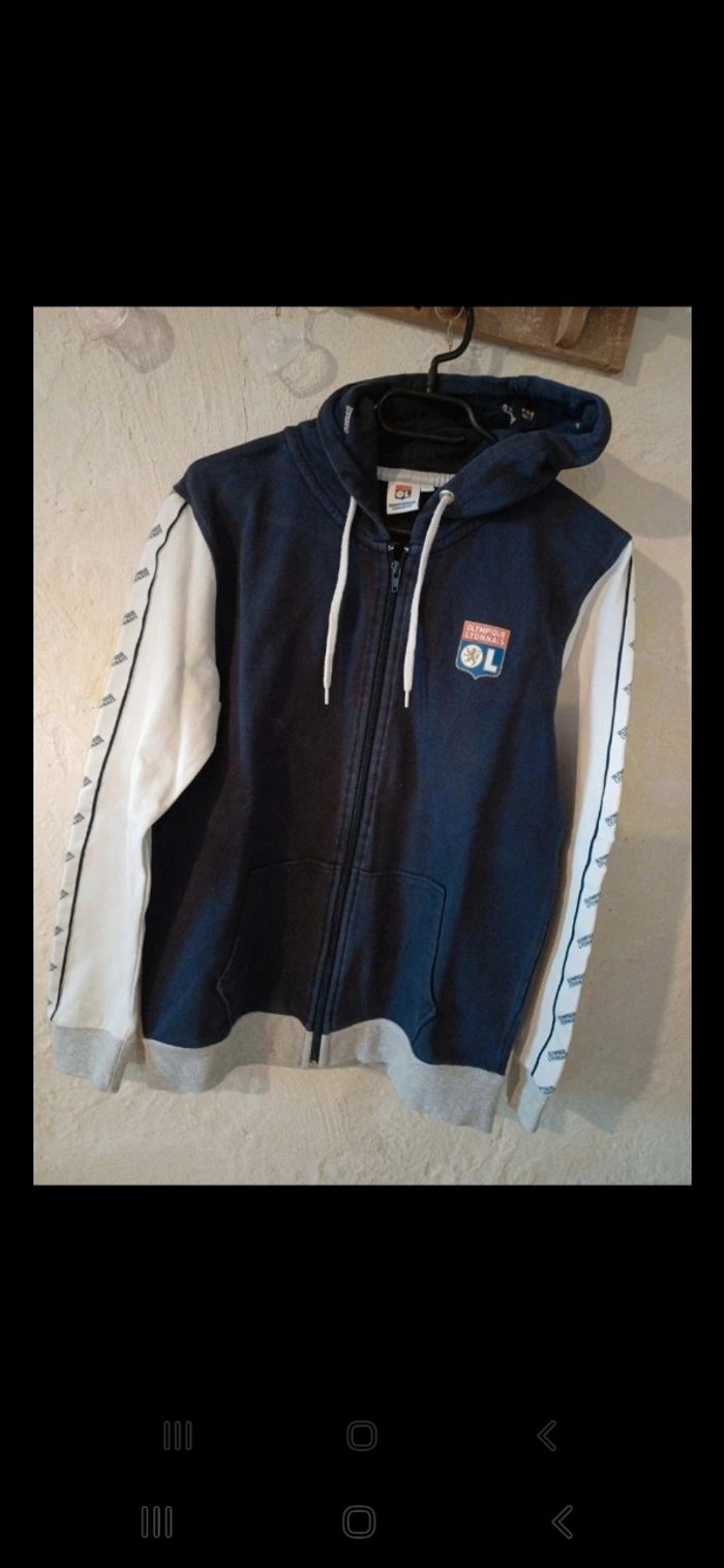 Sweat zippé à l avant avec capuche. Couleur bleu marine un peu passée à certains endroits . Noté L mais taille petit