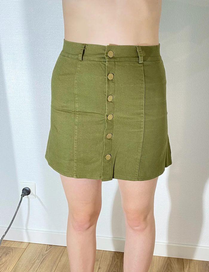 Mini jupe kaki à boutons Vendu en taille M mais convient à un S