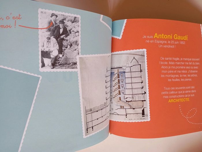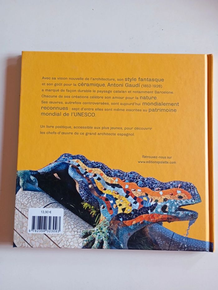 Avec sa vision nouvelle de l'architecture, son style fantasque et son goût pour la céramique, Antoni Gaudí (1852-1926) a marqué de façon durable le paysage catalan et notamment Barcelone. Chacune de ses créations célèbre son amour pour la nature. Ses oeuvres, autrefois controversées, sont aujourd'hui mondialement reconnues : sept d'entre elles sont même inscrites au patrimoine mondial de l'UNESCO. Un livre poétique, accessible aux plus jeunes, pour découvrir les chefs-d'oeuvre de ce grand architecte espagnol. Editeur : Artimini 40 pages Âge de lecture ‏ : ‎ 6 - 10 ans Dimensions ‏ : ‎ 22.1 x 1.2 x 22.2 cm Prix éditeur : 13,9€ Livre NEUF #espagne #gaudi #architecte