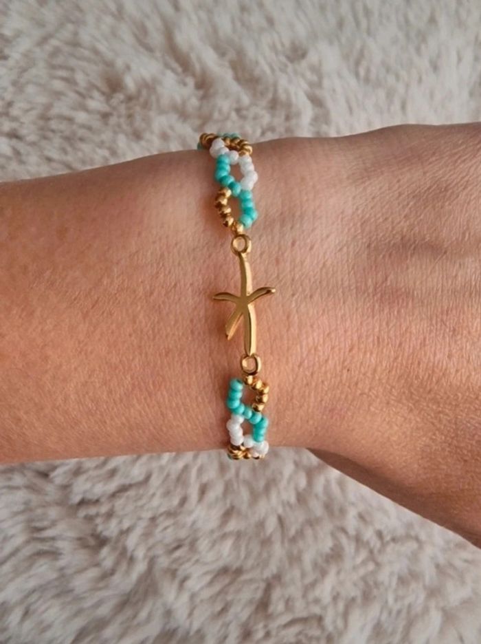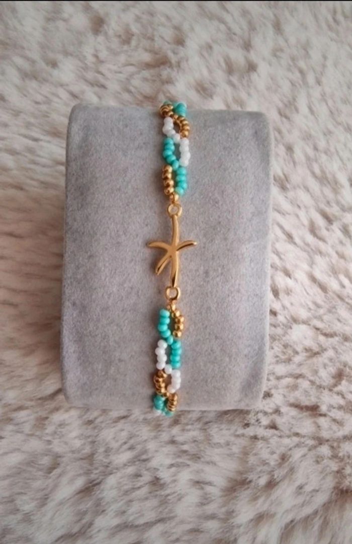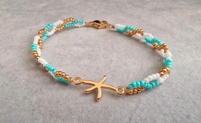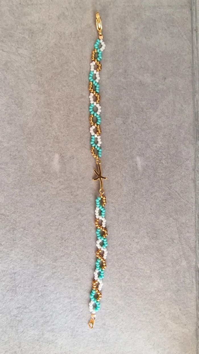 Bracelet en perles thème vacances/été étoile de mer, couleur vert d'eau, blanc et doré Marque Crystalia Perles comme neuf Taille 18cm #perles&co #braceletdeperles #perlesderocailles #braceletfemme #vacances #été #etoiledemer #doré