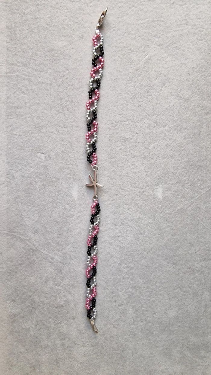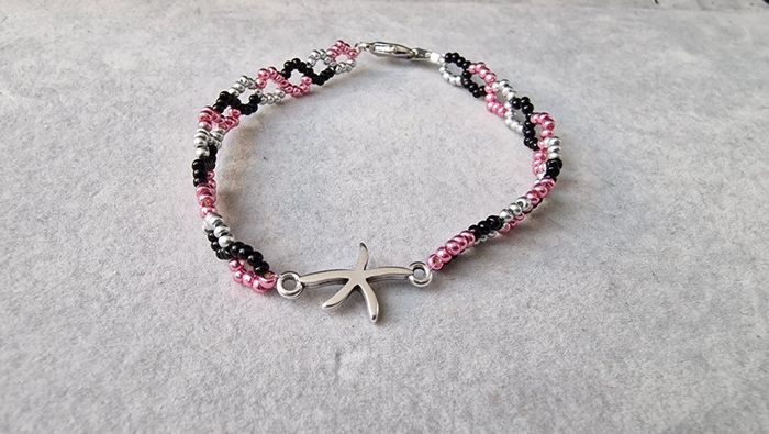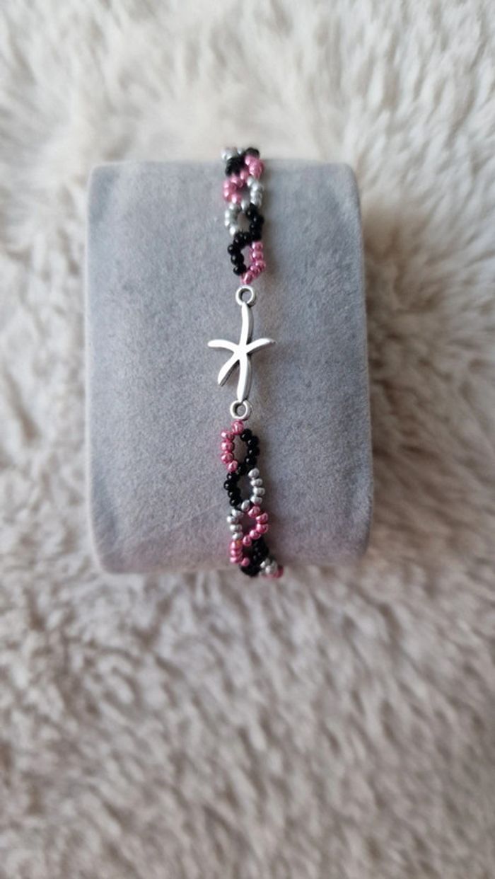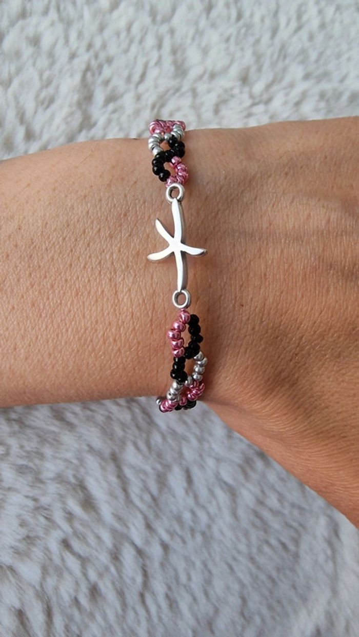 Bracelet en perles thème vacances/été étoile de mer, couleur rose, noir et argenté Marque Crystalia Perles comme neuf Taille 18cm #perles&co #braceletdeperles #perlesderocailles #braceletfemme #vacances #été #etoiledemer #argenté