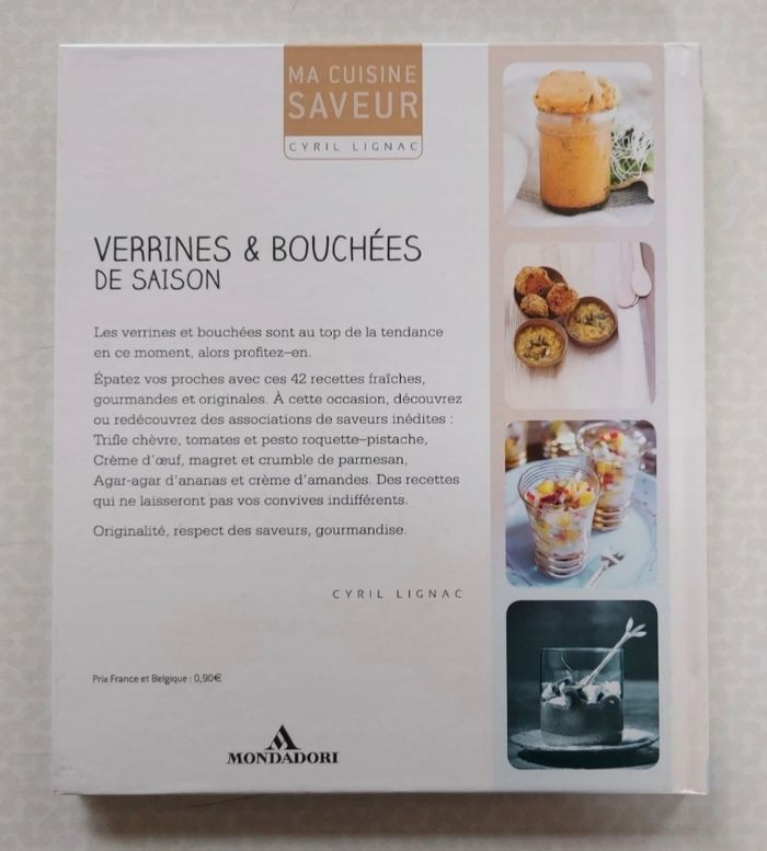 Je vends un livre de recettes de la "Collection Ma Cuisine Saveur - Cyril Lignac" : Numéro 1 - Verrines & Bouchées de saison (Année 2012). Le livre contient 116 pages. Neuf.