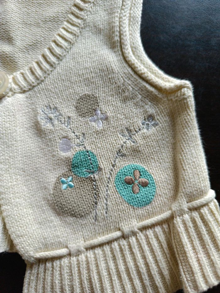 Boléro KITCHOUN Vert clair Broderies kakis, turquoises, argentées & blanches dans le bas Fermé par 1 bouton 100% Coton TAILLE 6 MOIS TRES BON ETAT Allez voir mes autres ventes!