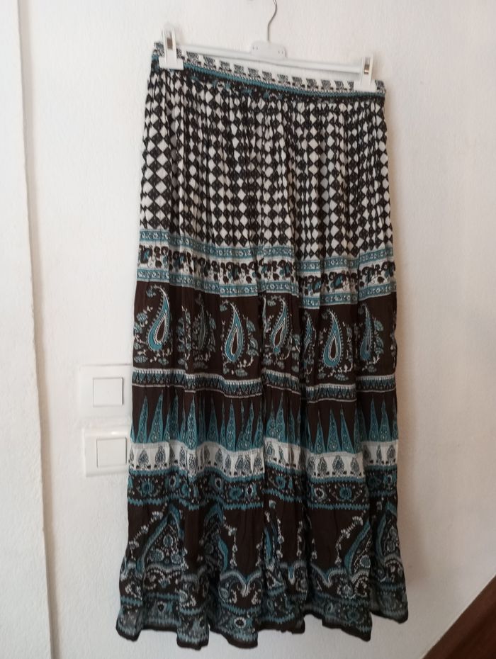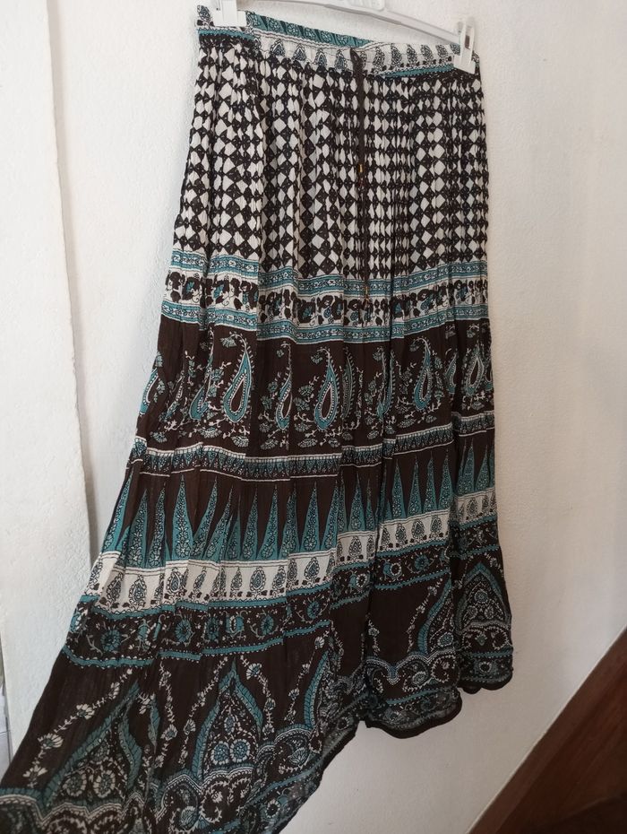 Superbe jupe longue femme 36/38 Marque WOMEN ONLY. En excellent état . Taille élastique avec cordon Bleu, marron, blanc Longueur 91 cm