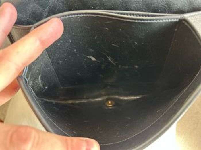 État : Très Bon état vintage. Traces intérieures. Les éventuelles traces visibles extérieures sur les photos sont atténuées à l’œil nu; le flash accentue les contrastes, mais le cuir conserve toute sa noblesse.