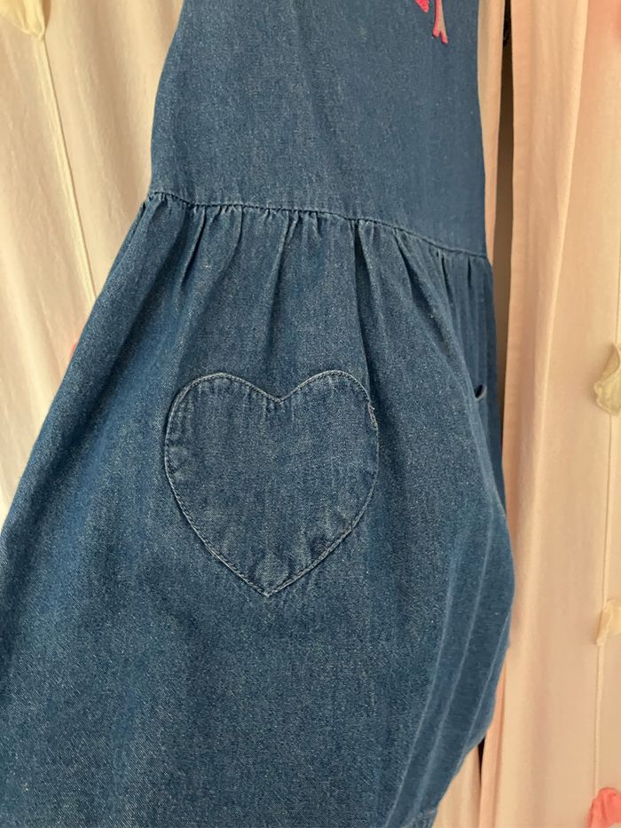 Robe bleu en jean souple. Taille 6 ans . Fermeture arrière avec boutons en forme de coeur. Poche déco sur l’avant en forme de cœur également. Robe neuve. Lavée 1 fois mais jamais portée. Marque : sergent Major