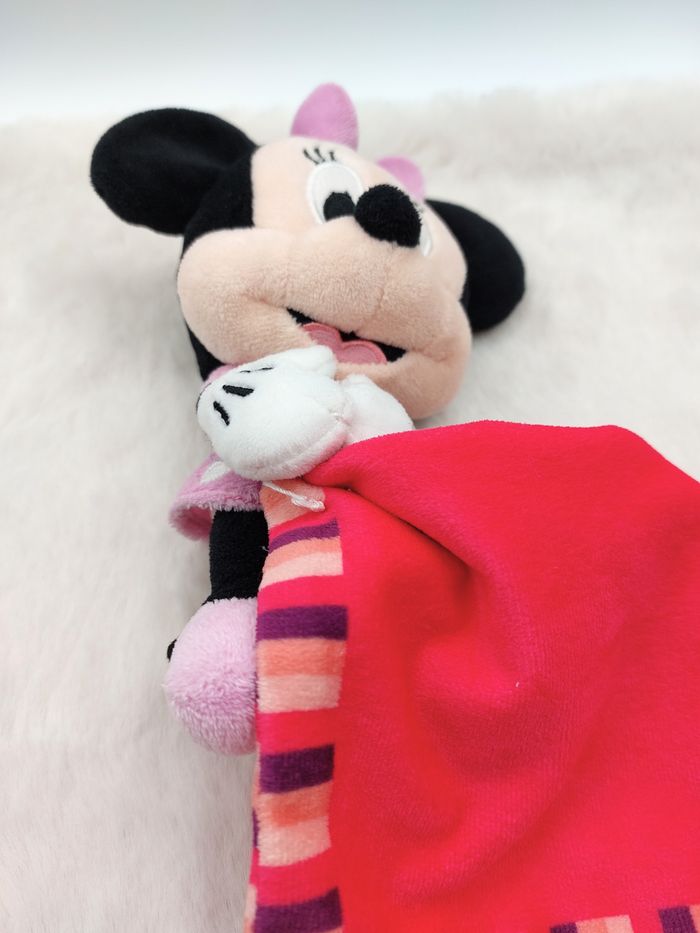 Peluche doudou Minnie mouchoir fuschia fleur au dos DISNEY robe rose pois blanc sûrement de la marque Nicotoy hauteur peluche : 19 cm Très bon état - étiquette coupée, le fil blanc d'attache du mouchoir à la peluche est visible et un peu distendu (photo 3) Envoi rapide Réf A12315 #minotresor #peluche #doudou #plush #knuffel #comforter