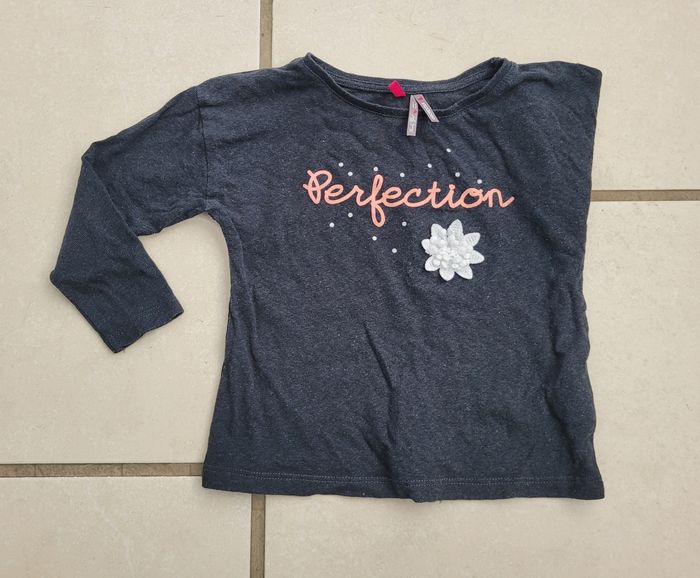 T-shirt manches longues, de couleur gris foncé noir, avec inscription et fleur, de la marque Orchestra, taille 2 ans (92 cm), en très bon état. Article lavé pour la vente.