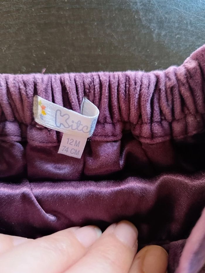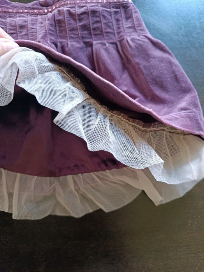 Jupe KITCHOUN Violette Effet velours ras Taille élastiquée sur la ceinture arrière Fermée par zip & bouton sur 1 côté Tulle rose clair dans le bas de la doublure Doublée polyester 100% Coton TAILLE 12 MOIS TRES BON ETAT Allez voir mes autres ventes!