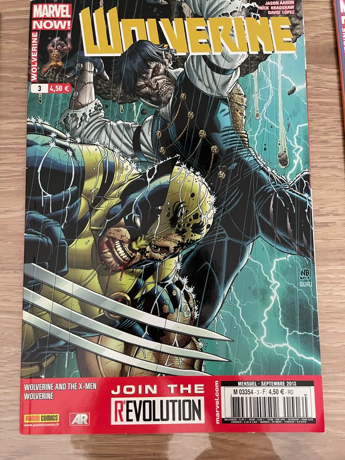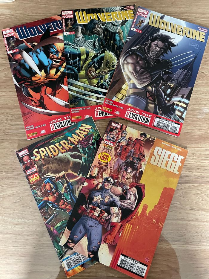 5 mensuels panini comics: - Siège 4 , janvier 2011, - Spider-Man 139, Août 2011, - Wolverine 1, Juillet 2013, - Wolverine 3 , septembre 2013, - Wolverine 4, octobre 2013, Marvel L’unité 7 euros 25 euros les 5