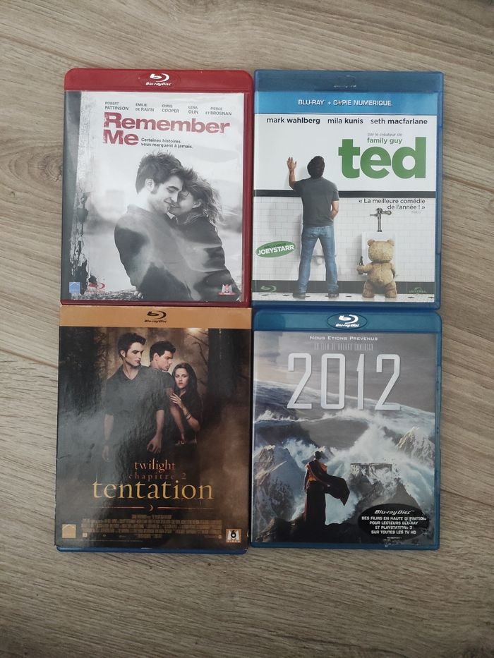 Je vend 4 blu-ray, ils sont tous en bon état sauf 2012 abîmé en bas a droite. - 2012 - Twilight 2 : Tentation - Ted - Remember Me 2€ unité ou 6€ le lot Remise en main propre sur Lyon et alentour ou envoi soigné