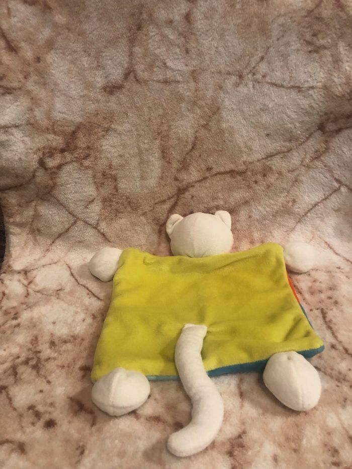 Doudou plat chat carré 4 couleur orange bleu foncé bleu clair vert Au dos couleur verte Obaibi Okaidi Occasion en parfait état Vous achetez le doudou que vous voyez sur la photo