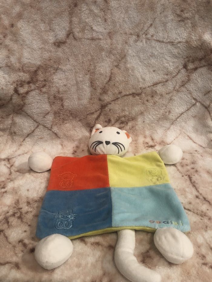 Doudou plat chat carre 4 couleurs orange bleu vert Obaibi Okaidi - photo numéro 1