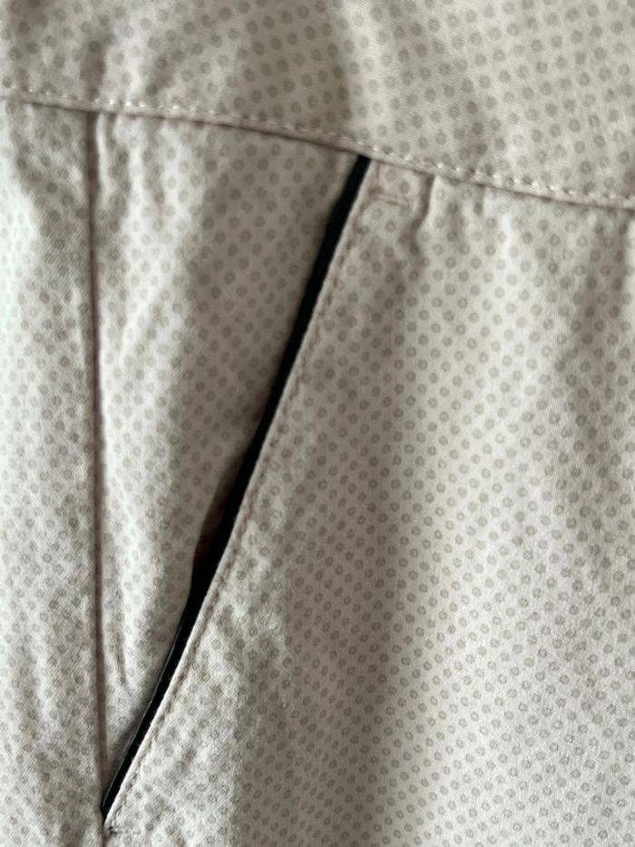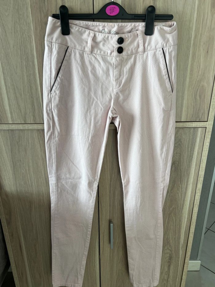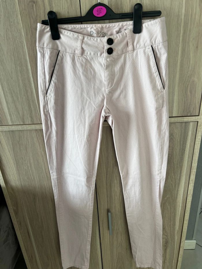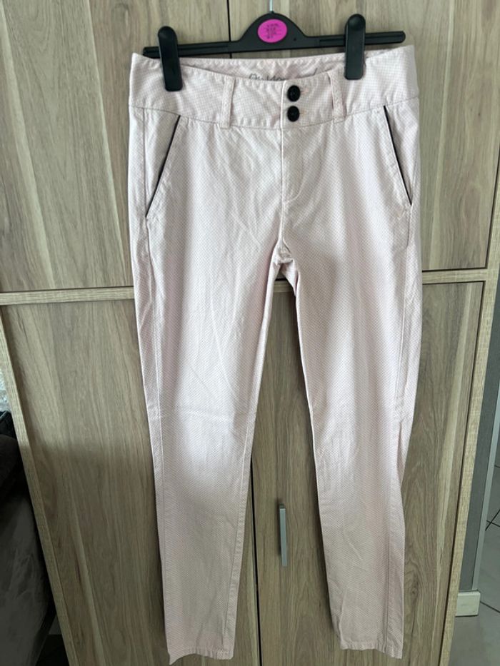 Pantalon DDP rose,claire Avec des petits motifs gris Bouton et bordure des poches noires ✨ dimension Taille 36 cm Longueur 101 cm Bon état