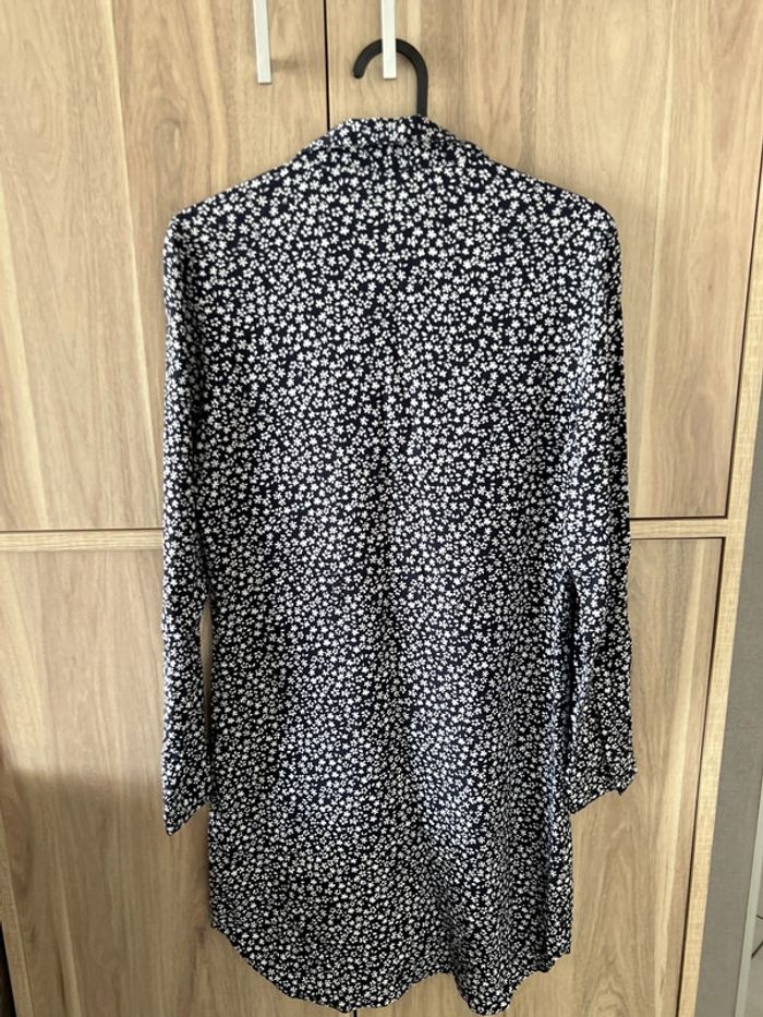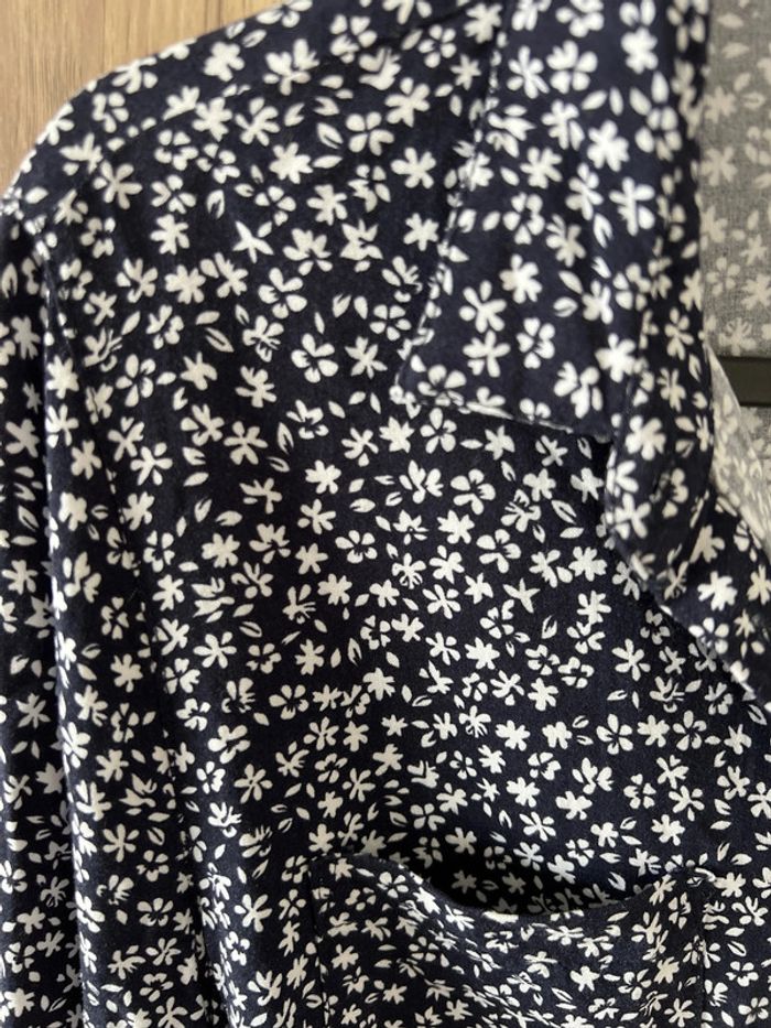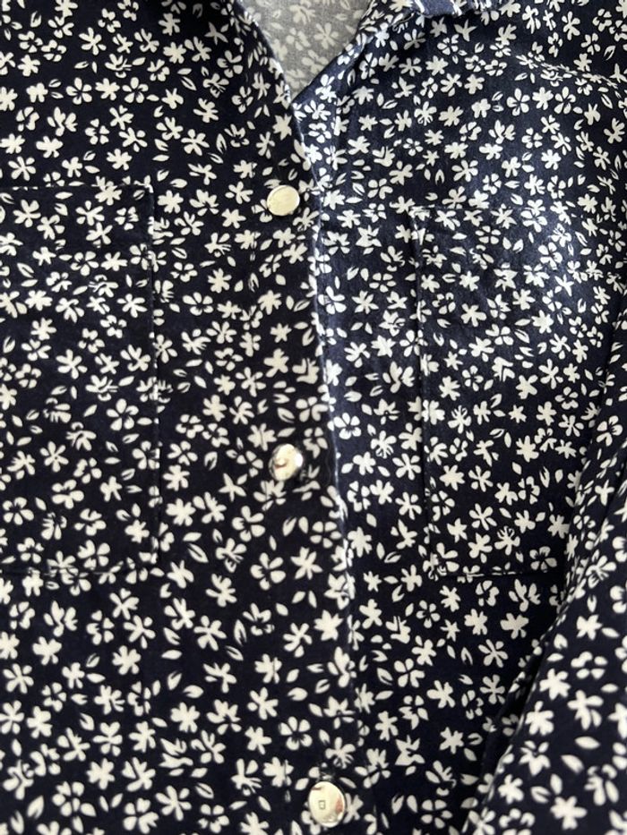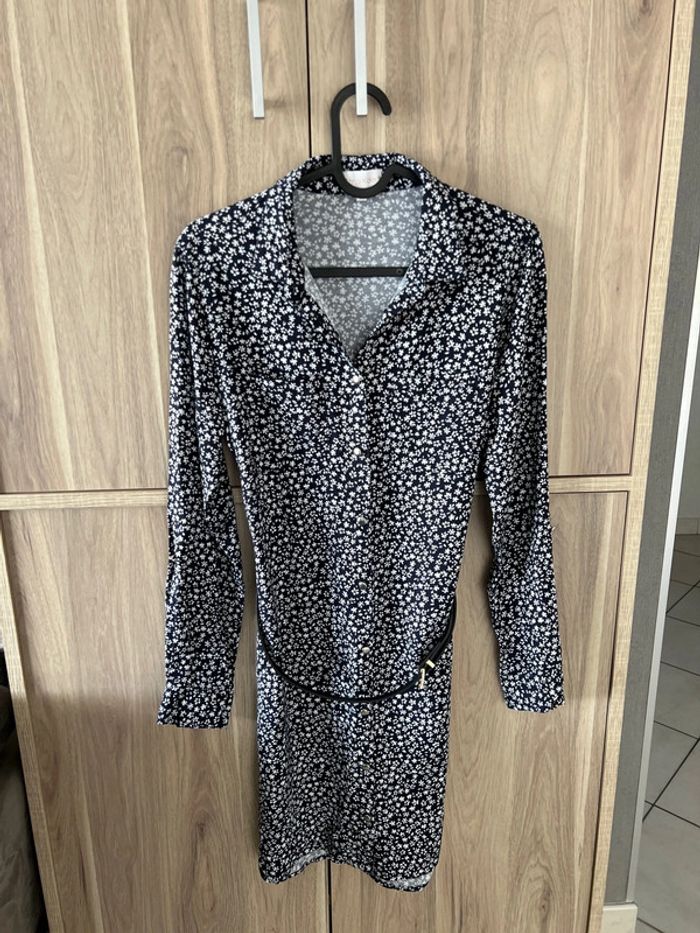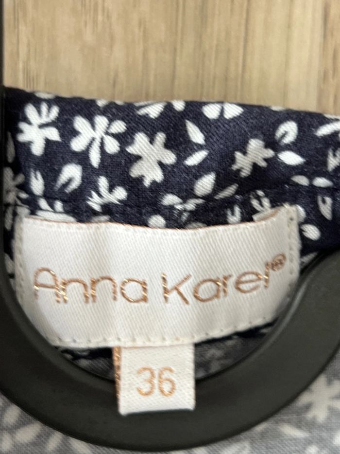Robe chemise Anna Karel Taille36 très bon état Épaule à épaule. 36 cm Longueur 78 cm Couleur bleu marine avec des petits motifs de fleurs blanches Bouton sur les manches pour pouvoir les remonter Je n’ai plus la ceinture d’origine, j’offre une petite ceinture noire avec la boucle dorée 103,5 cm
