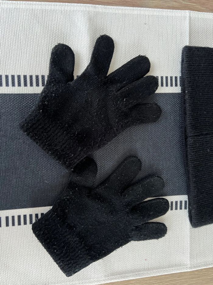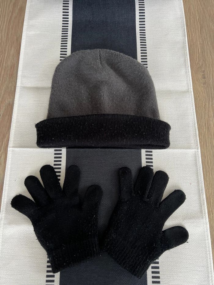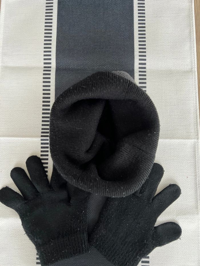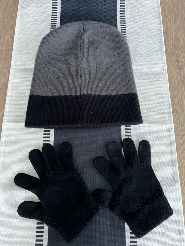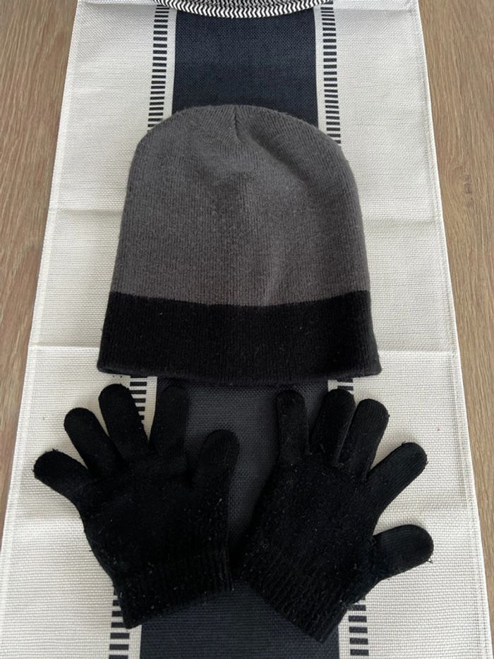 Bonnie, garçon, noir et gris 22 cm de largeur 24 cm de longueur Étirable Bien servi, mais peut servir encore Paire de gants noirs Bon état quelques Bouloches 17 cm de longueur Étirable