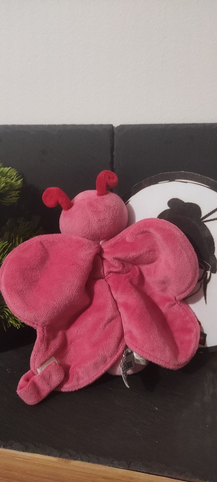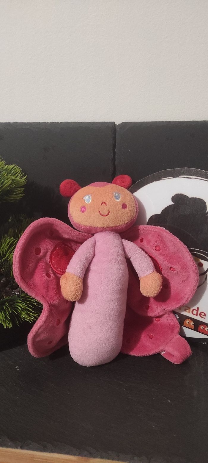 Doudou plat Papillon rose rouge orange attache tétine influx rond peluche Aile - photo numéro 1