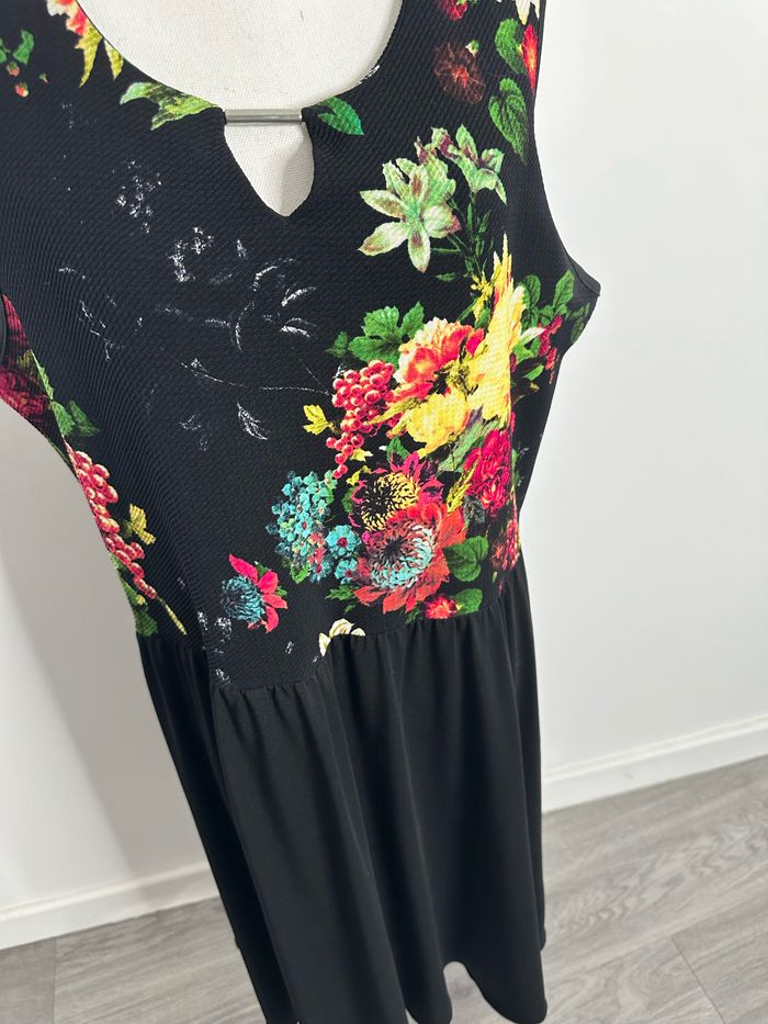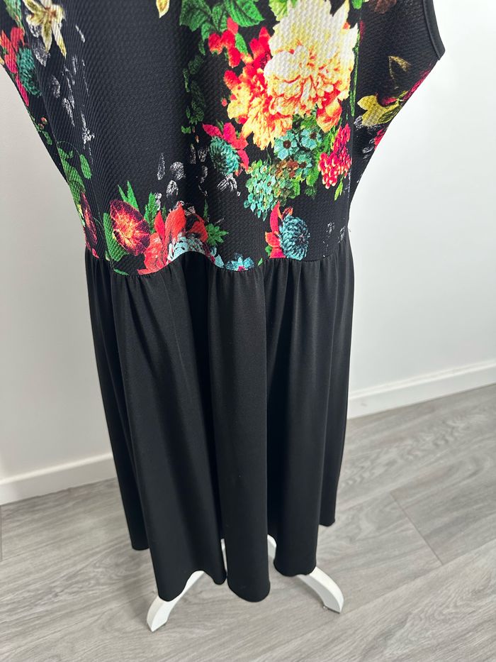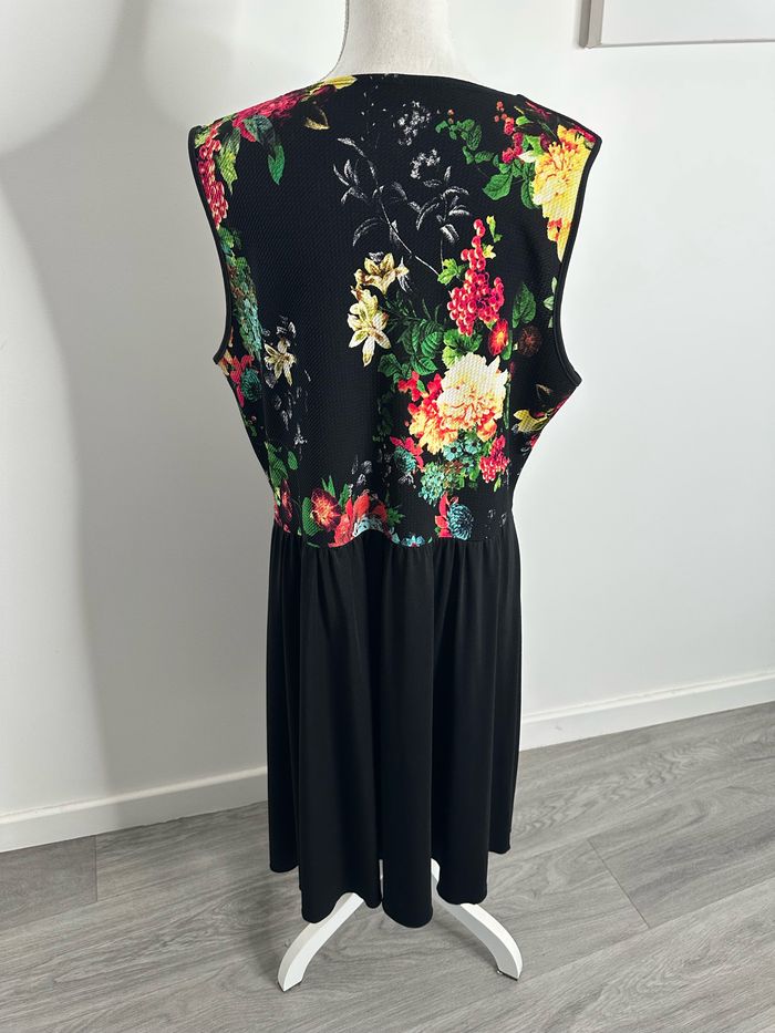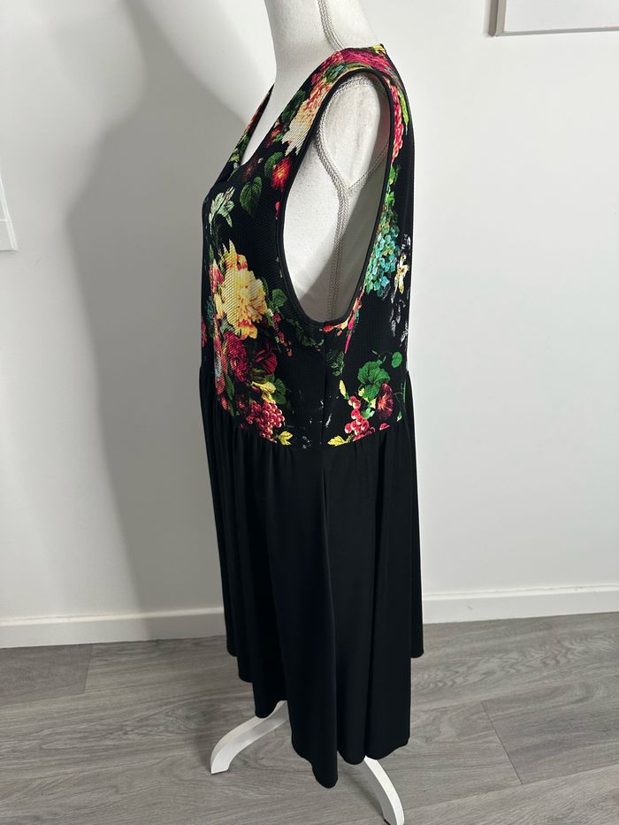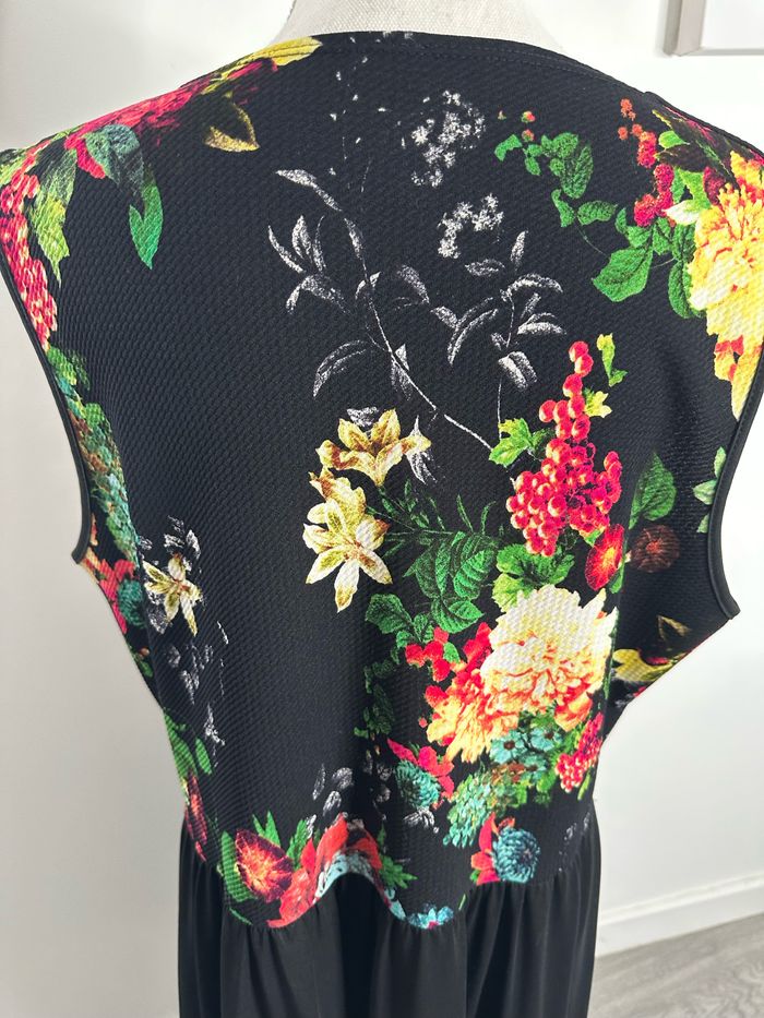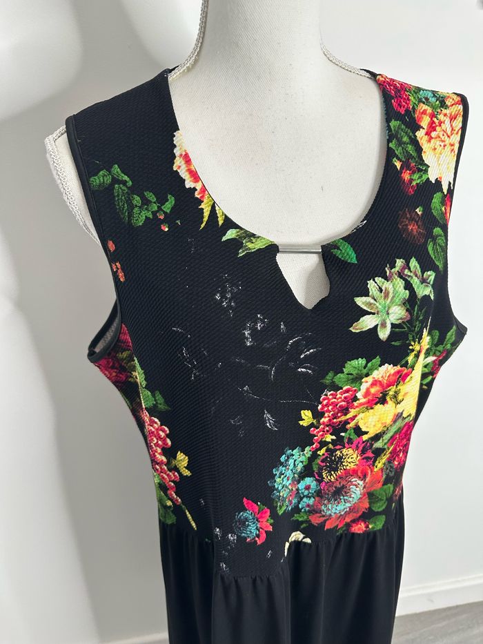 Robe - Excellent état - Taille 48 équivalent 4XL Dimensions en bas de l’annonce - Noire et multicolore - Imprimés fleurs - Sans manche - Polyester et élastane Dimensions: - 56 à 65cm niveau aisselles - 109cm de long