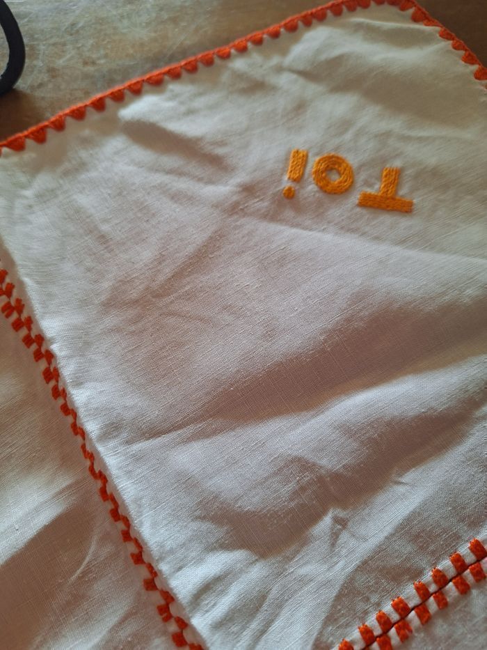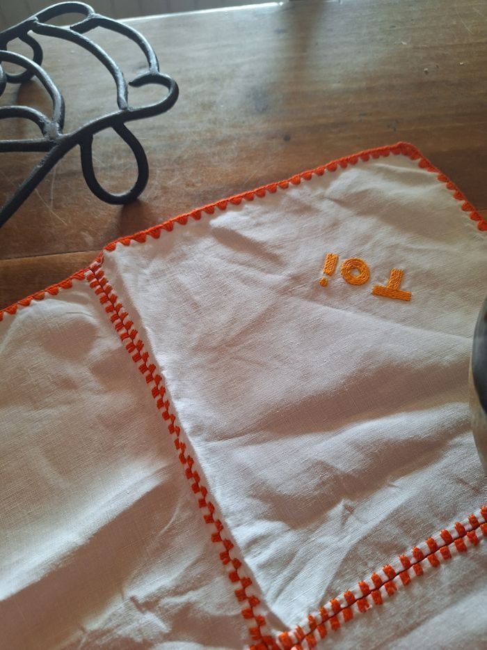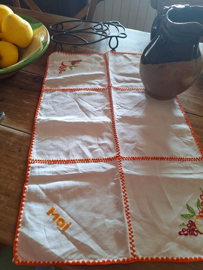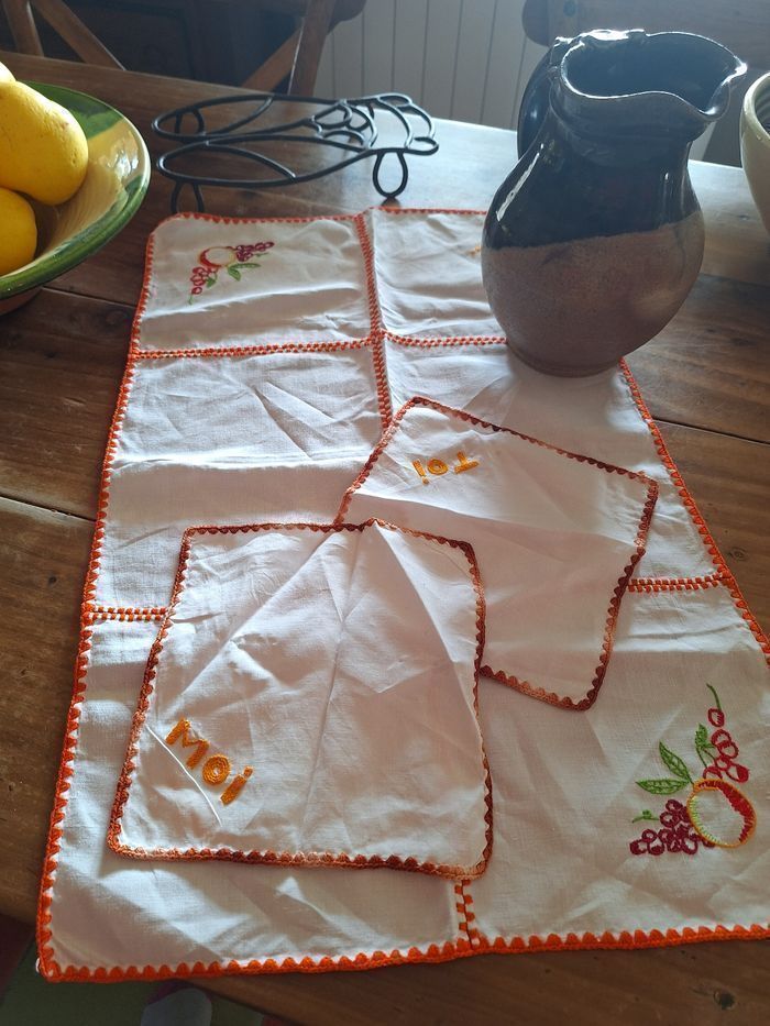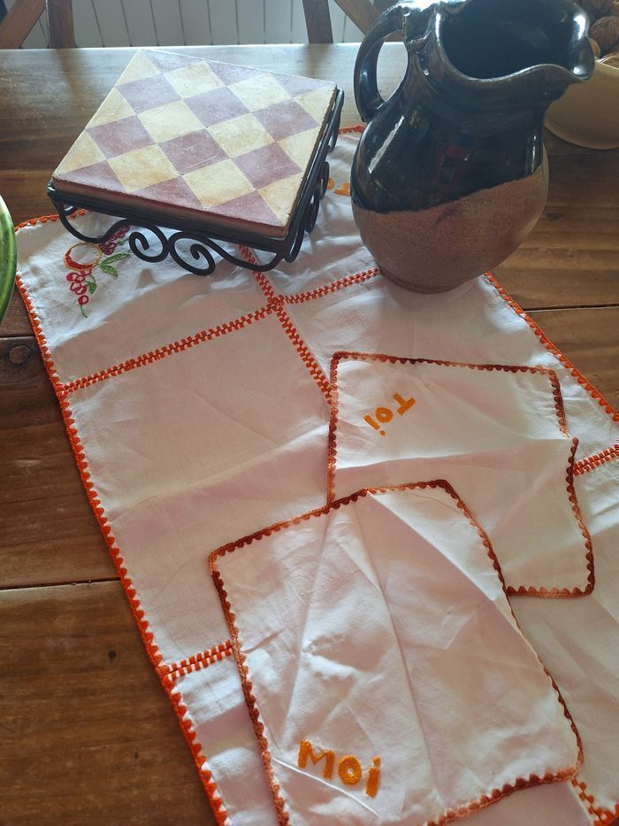 Chemin de table 45 cm de longueur Serviettes 18x18 cm , il y en a 2 avec toi et moi en inscription Jolies broderies Vintage mais état d ensemble correct, pas de taches , pas de trous Shabby Je ne connais pas la matière Consulter mes autres annonces pour composer des lots et faire des économies