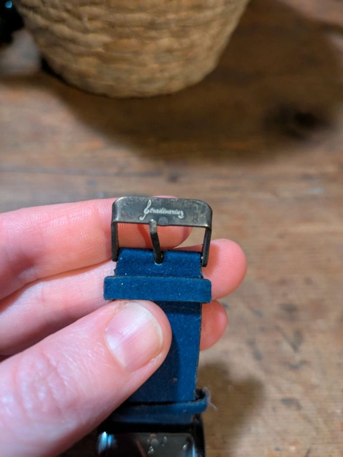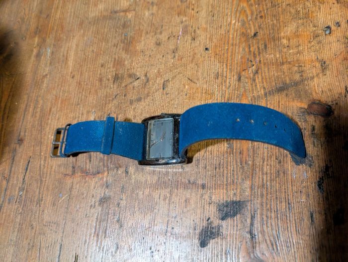 Un peu portée, micro rayures d'usage (visibles sur les photos et majorées par le flash). Bracelet velours bleu. Pile à changer