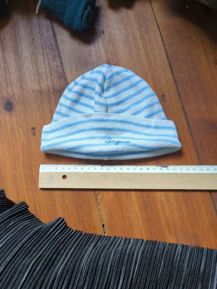 Petit bonnet enfant bébé vintage friperie clayeux rayé blanc bleu 42 cm