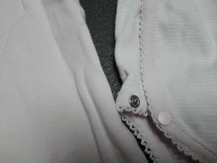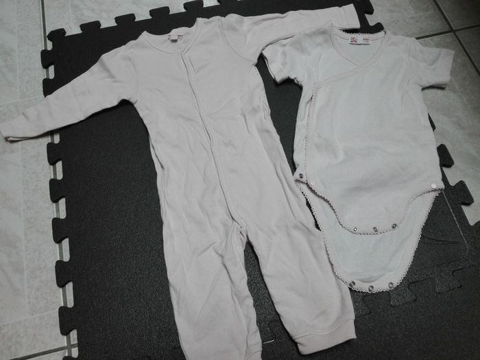 Body rose pâle rayé blanc portefeuille 9 mois (porté 2-3 fois) Pyjama rose pâle uni fin sans pieds 12 mois (neuf) Je vends néanmoins l'ensemble pour du 9 mois ! Ma fille est pourtant fine, mais n'a pas pu porter le pyjama car il taille très petit (bcp trop moulant pour du 12 mois !)