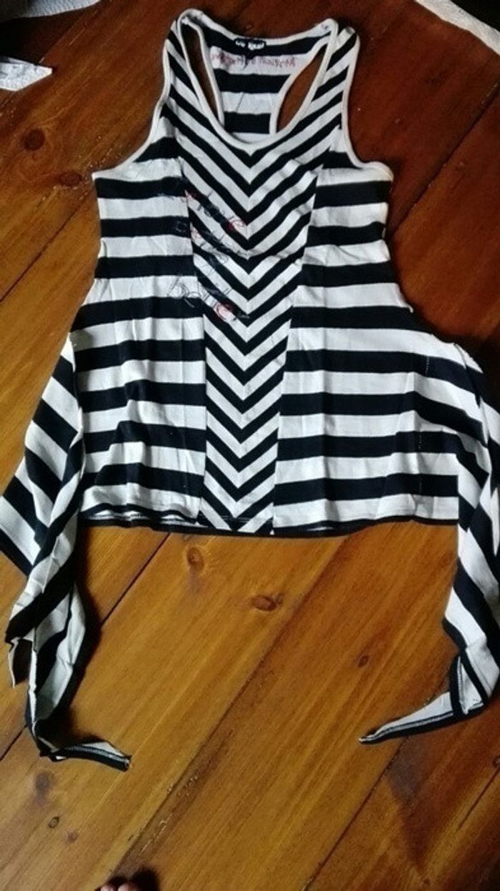 Superbe débardeur rayé noir et blanc Texte brodé "Franges" sur les cotés à nouer ou à laisser pendre