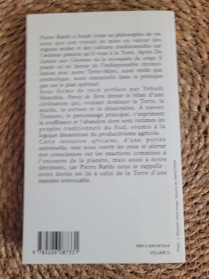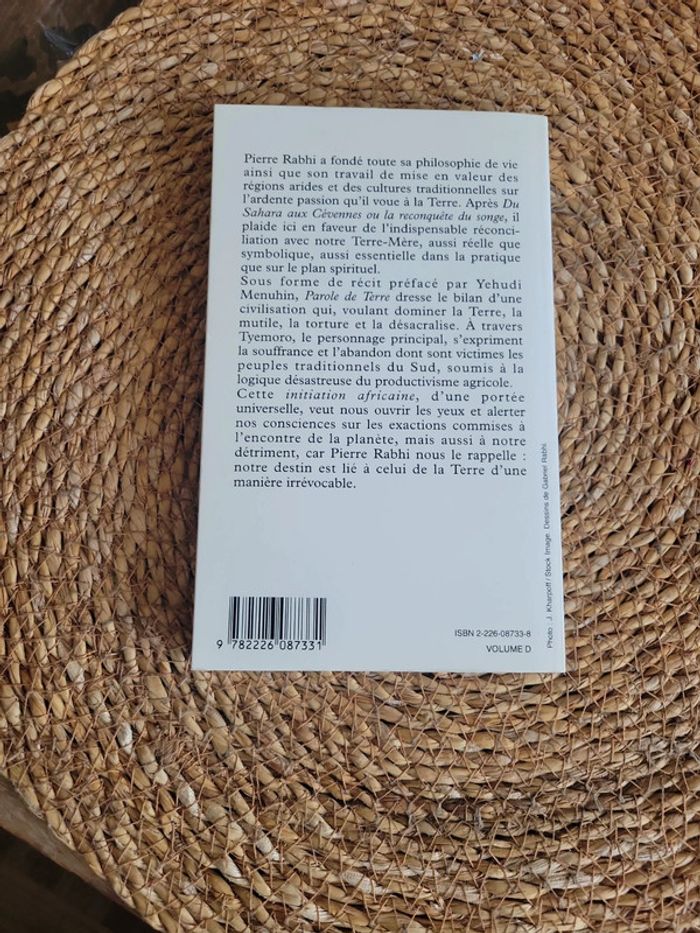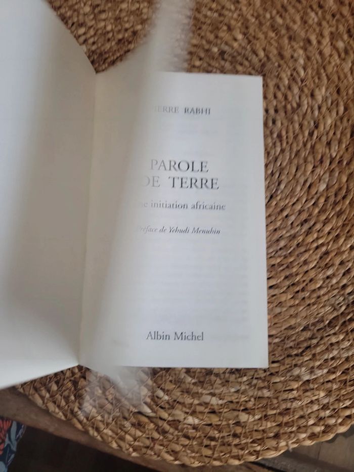 Parole de terre - Une initiation africaine - Poche Pierre Rabhi Yehudi Menuhin (Préfacier). Pierre Rabhia a fondé toute sa philosophie de vie ainsi que son travail de mise en valeur des régions arides et des cultures traditionnelles sur l'ardente passion qu'il voue à la Terre. Après Su Sahara aux Cévennes ou la reconquête du songe, il plaide ici en faveur de l'indispensable réconciliation avec notre Terre-Mère, aussi réelle que symbolique, aussi essentielle dans la pratique que sur le plan spirituel. Sous forme de récit préfacé par Yehudi Menuhin, Parole de Terre dresse le bilan d'une civilisation qui, voulant dominer la Terre, la mutile, la torture et la désacralise. A travers Tyemoro, le personnage principal, s'expriment la souffrance et l'abandon dont sont victimes les peuples traditionnels du Sud, soumis à la logique désastreuse du productivisme agricole. Cette initiation africaine, d'une portée universelle, veut nous ouvrir les yeux et alerter nos consciences sur les exactions commises à l'encontre de la planète, mais aussi à notre détriment, car Pierre Rabhi nous le rappelle : notre destin est lié à celui de la Terre d'une manière irrévocable.