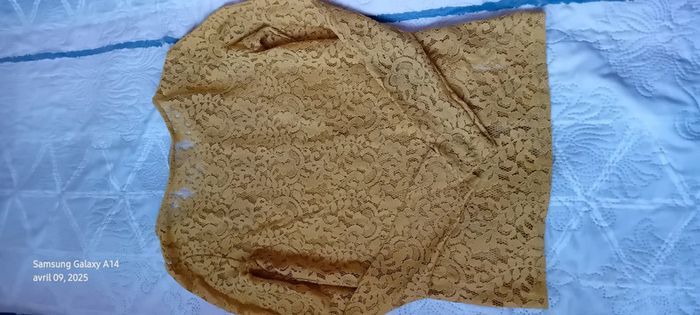Haut manches longues col rond en dentelle bandes devant motif floral longueur 60 cm largeur aisselles à aisselles 40 cm largeur épaules 34 cm longueur manches 47 cm couleur moutarde très peu porté en très bon état #midole #midolefemme #midolefemme36 ##midolefemmeS #femme36 #femmeS #hautdentelle36 #dentelle #motiffloral #promod #moutarde