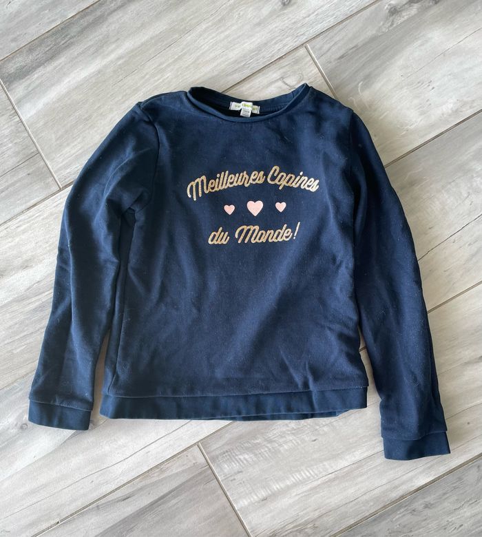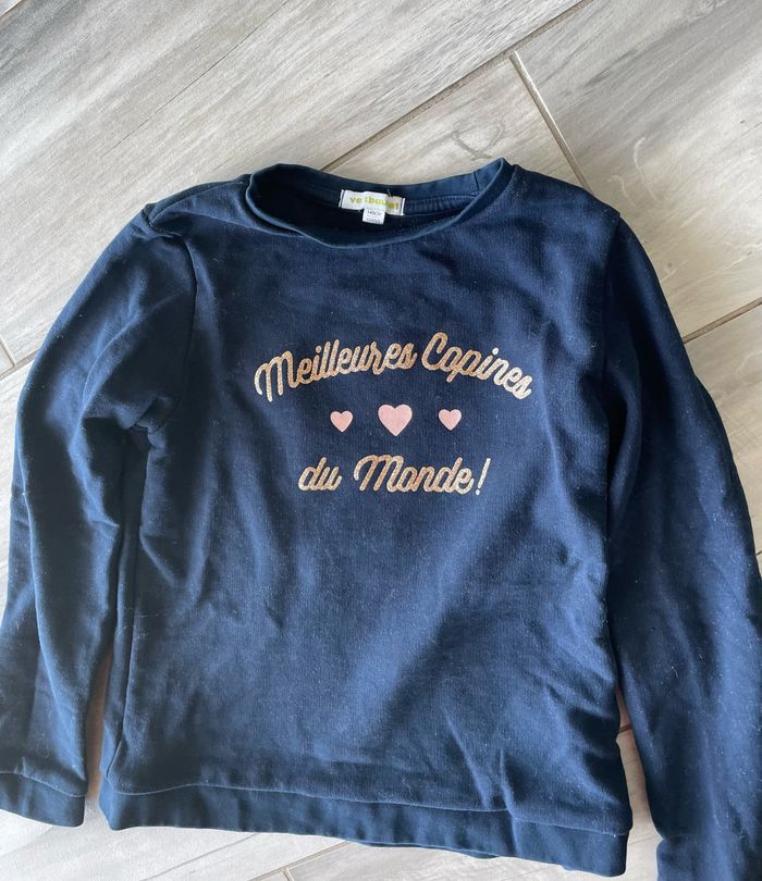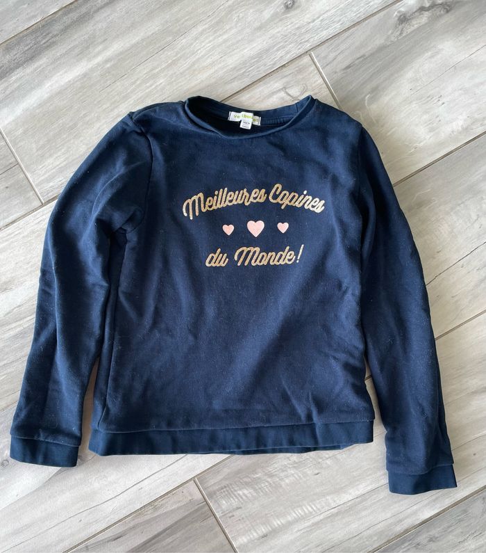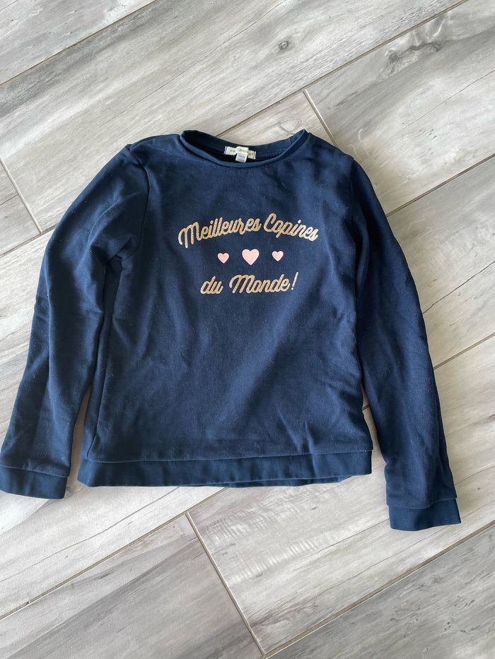 Sweat T 10 ans Vert Baudet Couleur bleu marine avec dessins cœurs et inscriptions lettres dorées Manches longues Très bon état