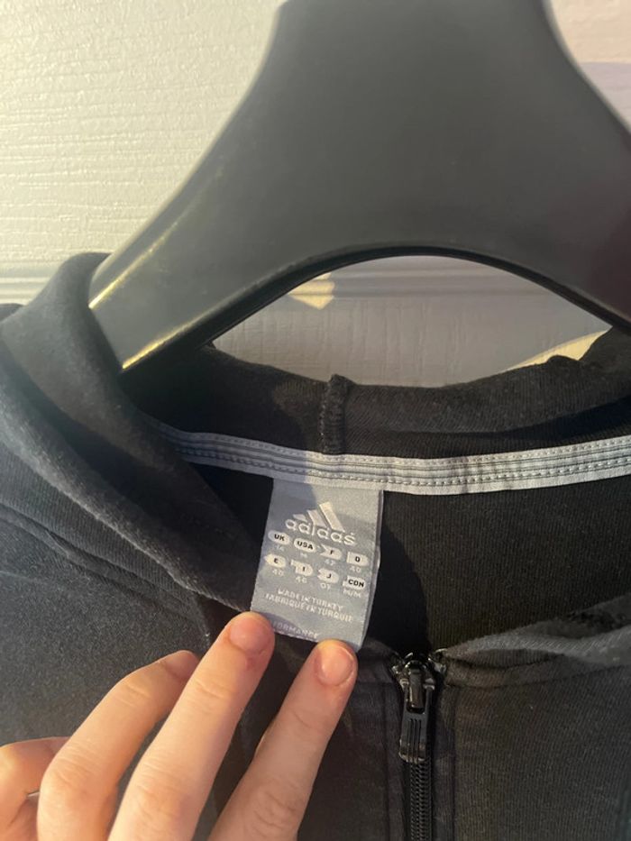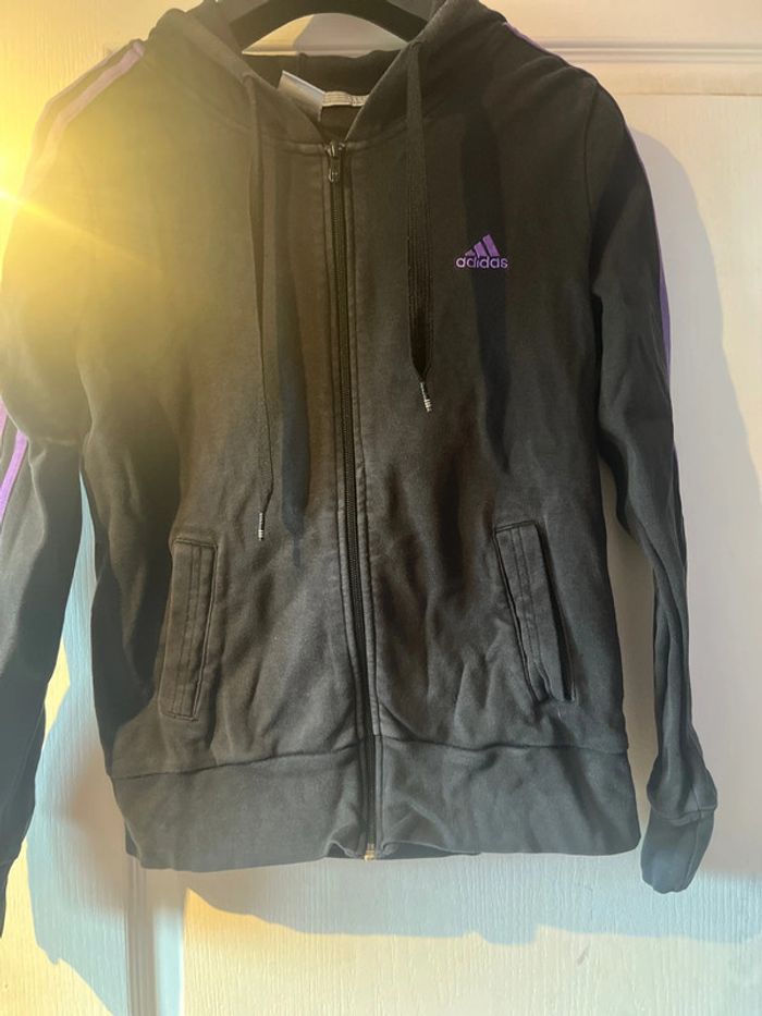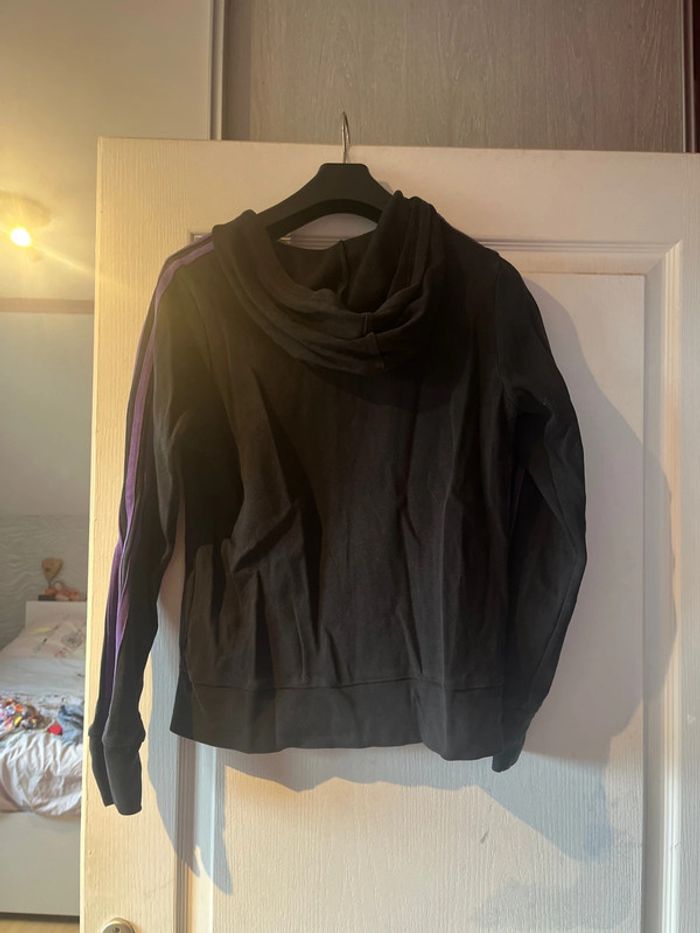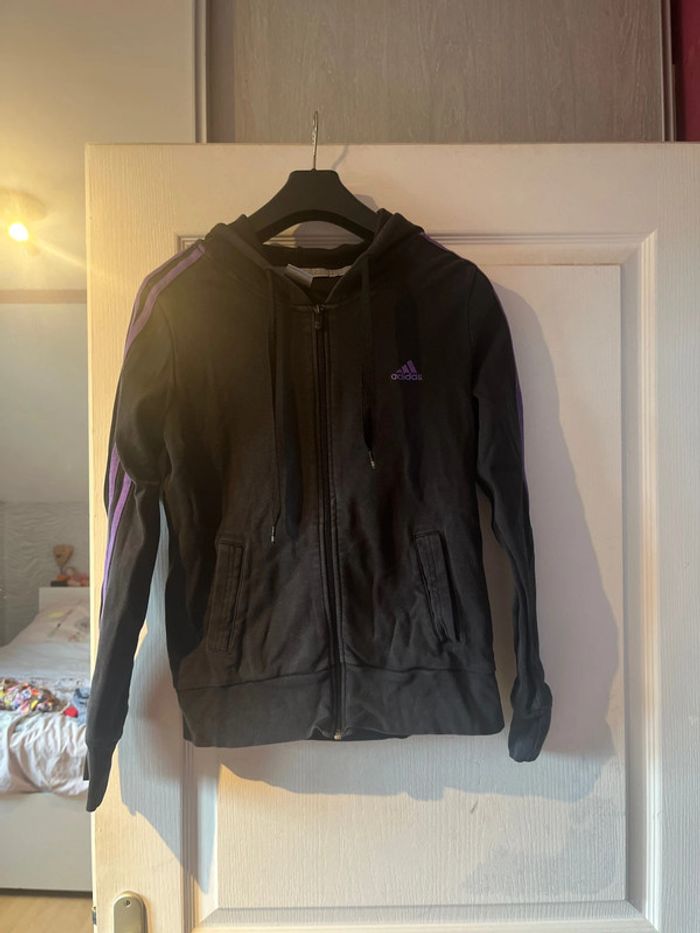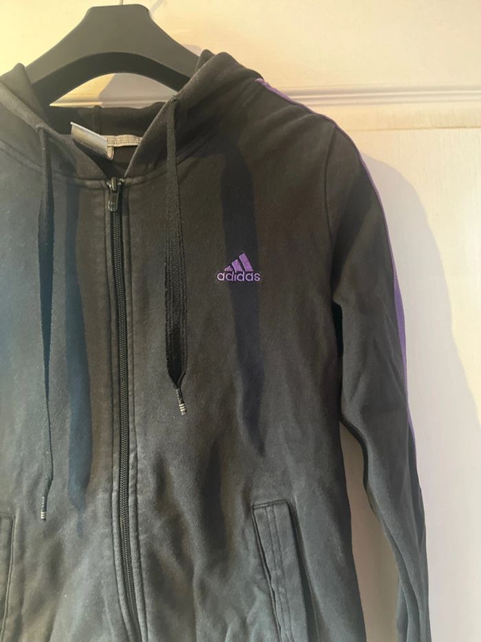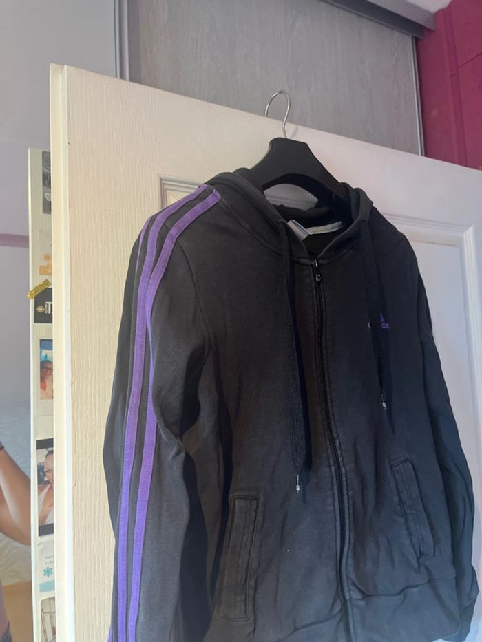 Sweat, à capuche, Adidas, taille L. Couleur noir et violet en bon état.